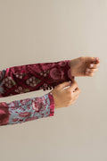 Patchwork-inspired burgundy shirt and pants, paired with a rich silk dupatta—artful, warm, and full of texture.