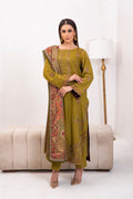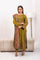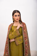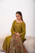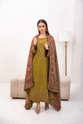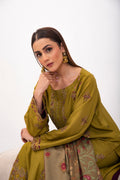 Olivia. Stunning olive green subtly contrast with plum, gold tilla and minimally adorned with embroidery. Complimented by a striking printed twil shawl in rich garnet. Telling the tellis singing into the colours of nature, it stands as a collectors dream refined and truly unforgettable.