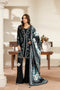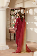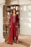 Lalsaa is an elegant three-piece ensemble crafted in a deep maroon tone, offering a refined blend of richness and seasonal warmth. The long, straight-cut kurta features a modest V-neckline and is detailed with intricate, symmetrical embroidery in soft gold and off-white. Delicate motifs enhance the sleeves, while an ornate embroidered pattern along the lower sides adds a graceful finishing touch.