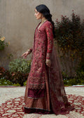 A pink-maroon karandi shirt, showcasing intricate handworked maroon embroidery with baitki and crystal-cut beads. The neckline is adorned with mirror-cut diamond motifs that extend down the length of the ensemble, accompanied by double-edged sleeves for added detail. Paired with gold-maroon jamawar pants, accented with a velvet patti for a refined touch. The look is completed with a zari net dupatta, featuring maroon embroidery, and a rich organza pallu lavishly embellished with gold sequins.