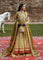 A floor-length lime peshwaz crafted from luxurious karandi fabric, adorned with radiant square cutwork around the shoulders. The design highlights a crescent-shaped motif in delicate white and silver threadwork, elegantly embellished with stones and dabka, and edged with a touch of orange for contrast. Full sleeves feature intricate gota work, while the ensemble is paired with flared azaar pants, accented by orange trims and gold embroidery. The look is completed by a slightly darker organza dupatta, showcasing a richly embroidered pallu with an orange base, adding a refined, opulent finish.