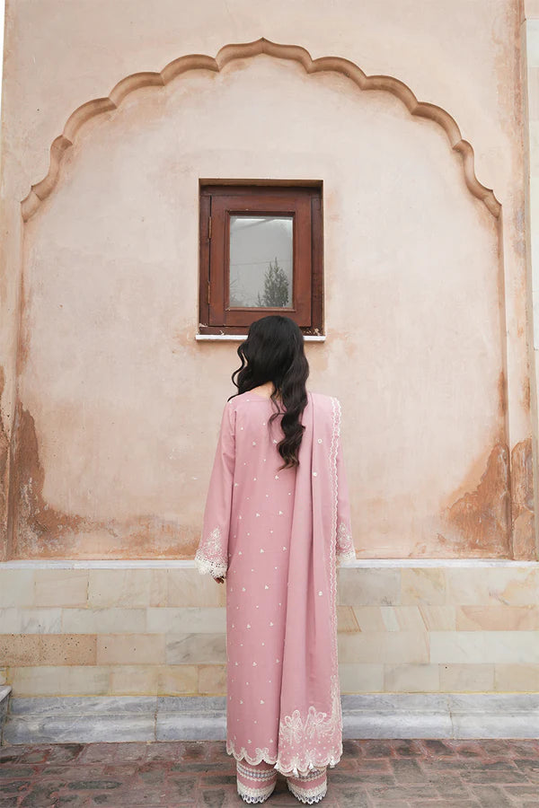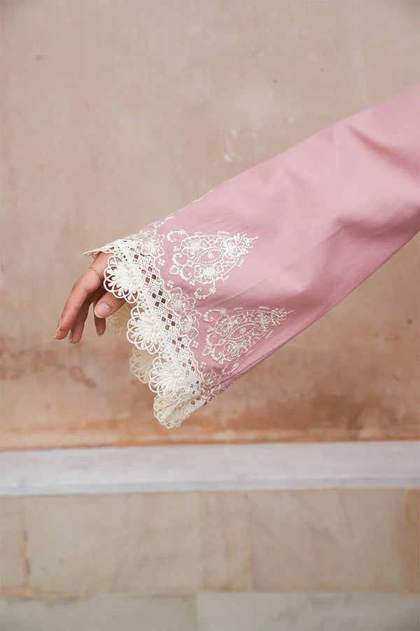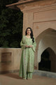 Feminine and unforgettable, "Esra" is a stunning three-piece outfit in pistachio green, crafted on a karandi canvas. The shirt is adorned with schiffli cutwork on the hem and sleeves, paired with matching trousers and a beautifully embroidered dupatta, making it the perfect seasonal outfit.