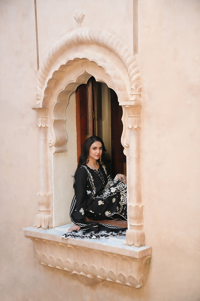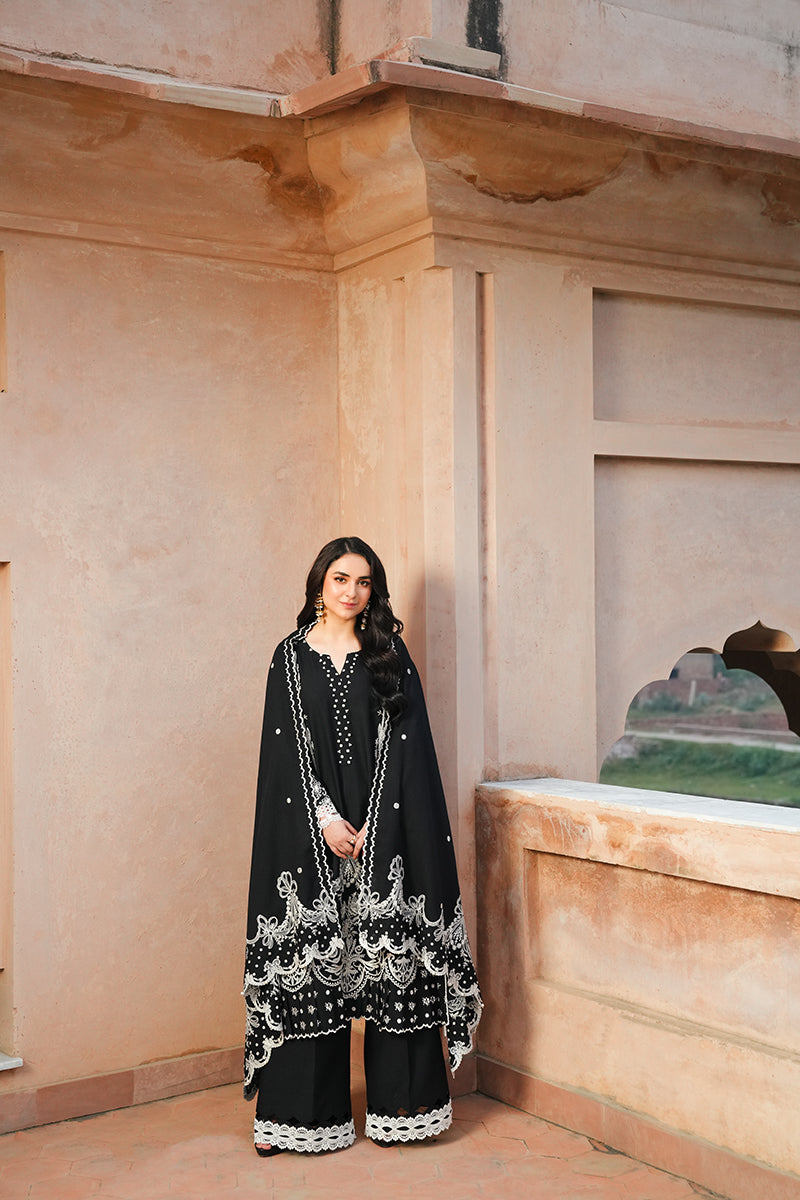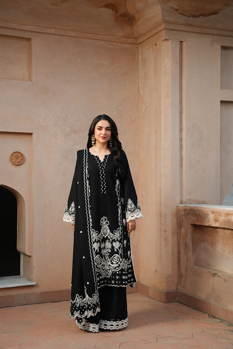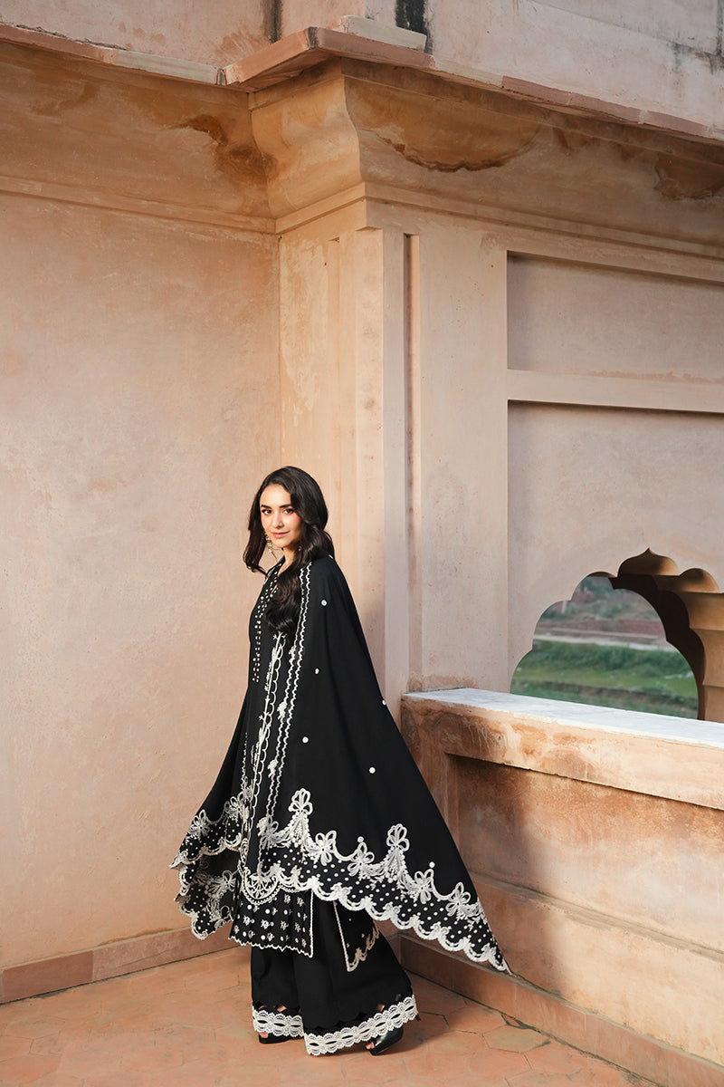 Playing with the season's harmony, Luna is a karandi-based 3-piece outfit adorned with cream details on a black canvas. The shirt features aesthetic embellishments along the sleeves, neckline, and hem, paired with solid black trousers and a beautiful dupatta with embroidered pallus, making it an essential choice for the season.
