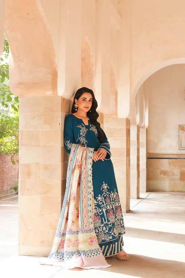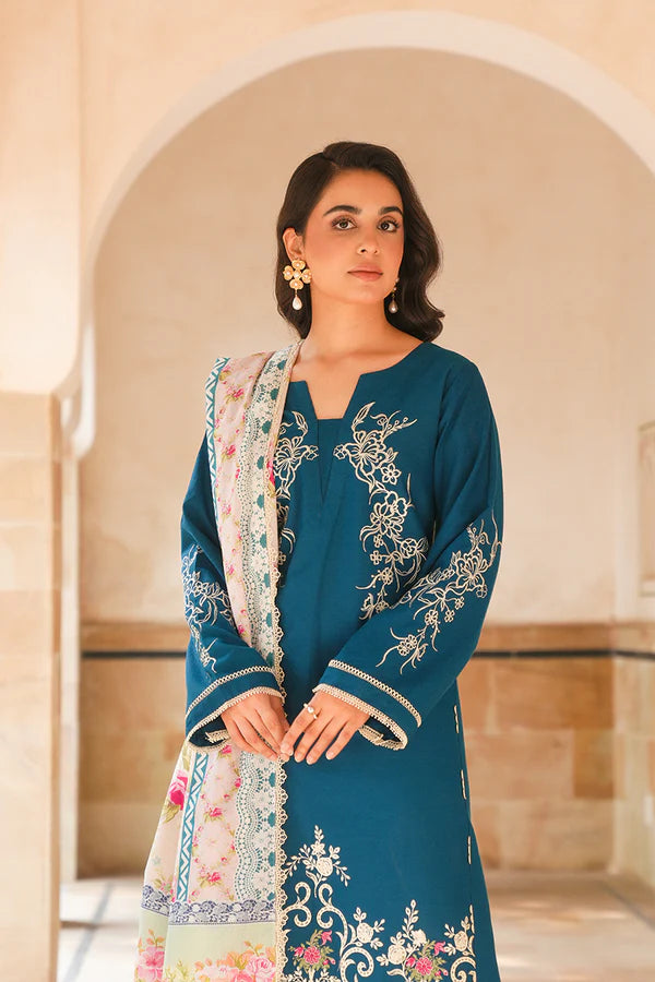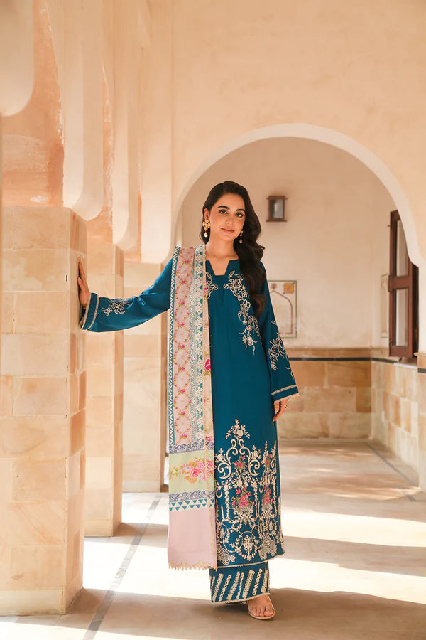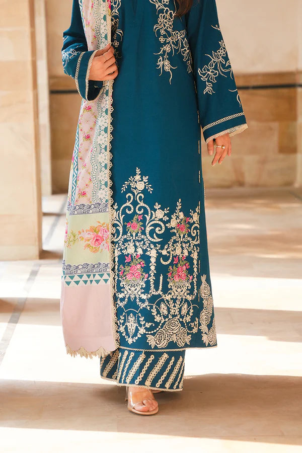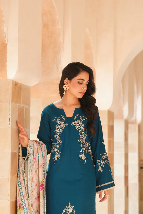 Roha is a beautiful 3-piece composition in a soft nude pink on a Karandi canvas. Accented with creme embroidery along the neckline, hem, and sleeves, this shirt is paired with matching trousers and delicately crafted pallus on dupatta, creating a chic winter ensemble.