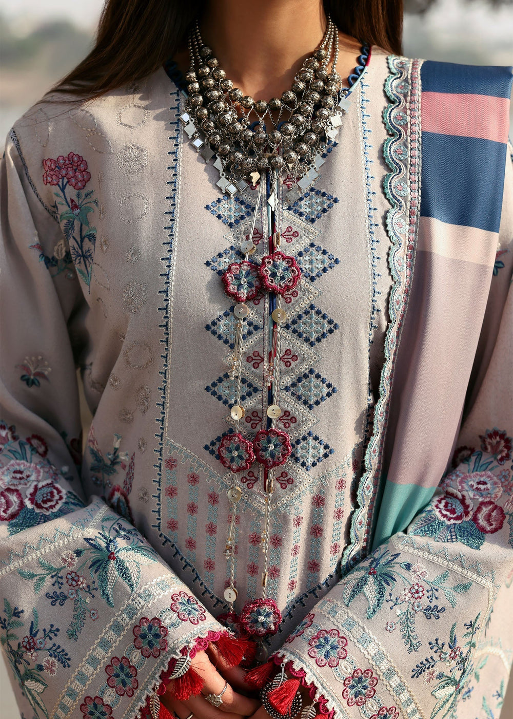 Soft like snow in summer , this elegant and versatile grey karandi option is for those who prefer sophistication. Accented with gorgeous floral bunches and beautiful borders , the striped double sided printed shawl brings the outfit a statement appeal. Don’t miss the generous floral embroidery framing the shawl on all four sides making it a perfect feminine pick to kick start the season.