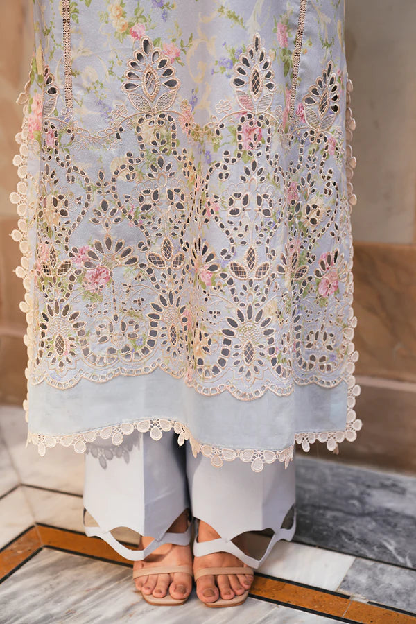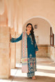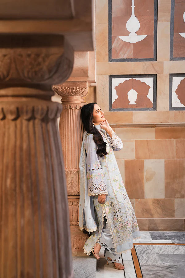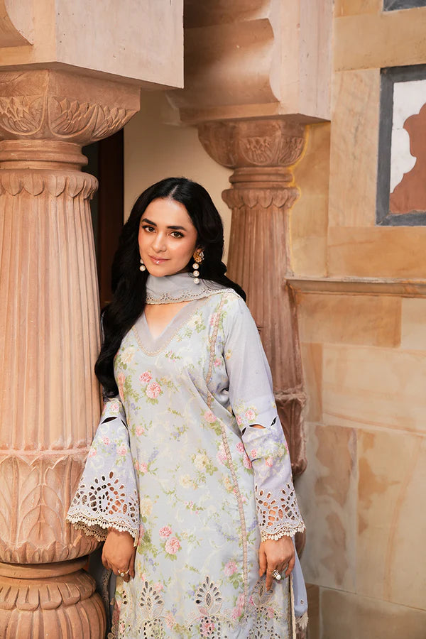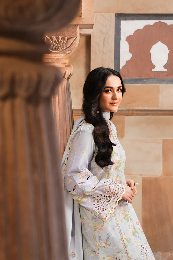 Zircon is the threshold to breezy charm. This off-white, 3-piece Karandi ensemble is embroidered with off-white, green and aqua accents along the neckline, hem, and sleeves. Paired with matching trousers and a floral-printed dupatta, it is a perfect ensemble for a winter sun-downer.