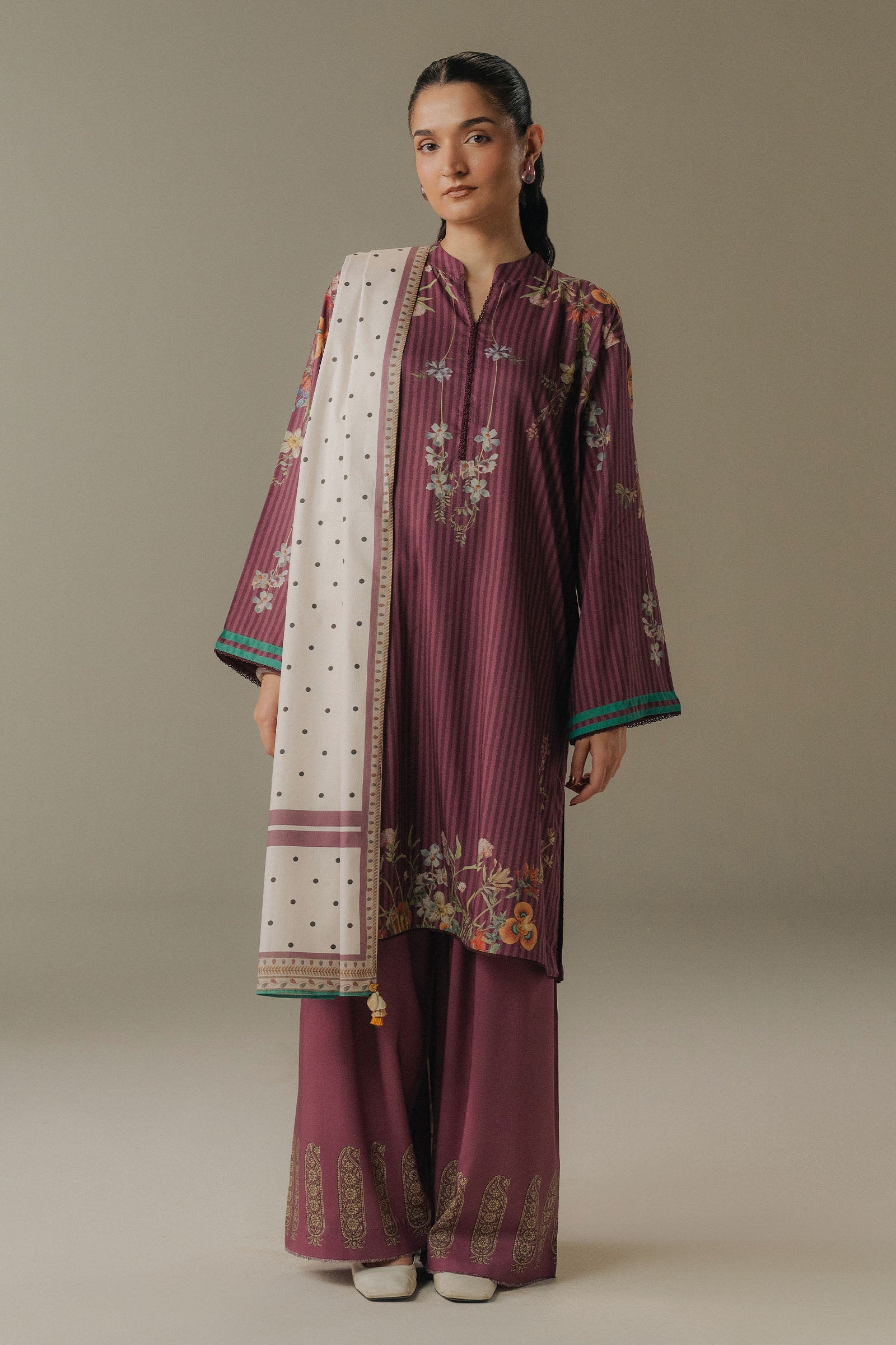 A tan rose striped shirt inspired by delicate floral motifs, paired with a tan rose trouser adorned with subtle paisley patterns. The look is completed with an off-white shawl featuring classic black polka dots, creating a timeless and effortlessly elegant ensemble.