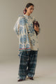 An Atlantic deep shirt inspired by lush botanical elements, paired with matching trousers adorned with delicate floral patterns. The look is completed with an Atlantic deep shawl featuring a mix of stripes and florals, creating a refined, cohesive ensemble that beautifully blends depth and natural elegance.