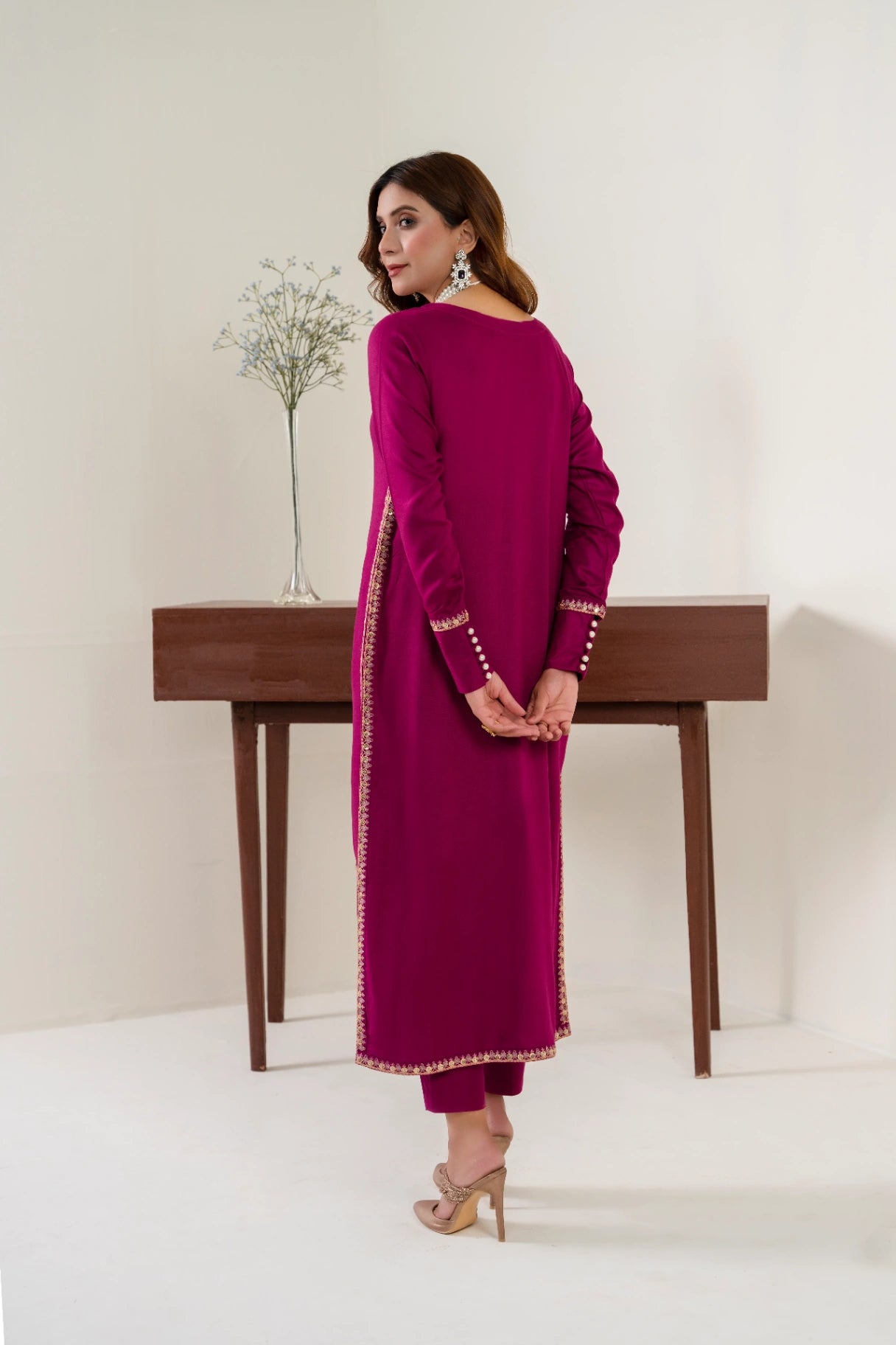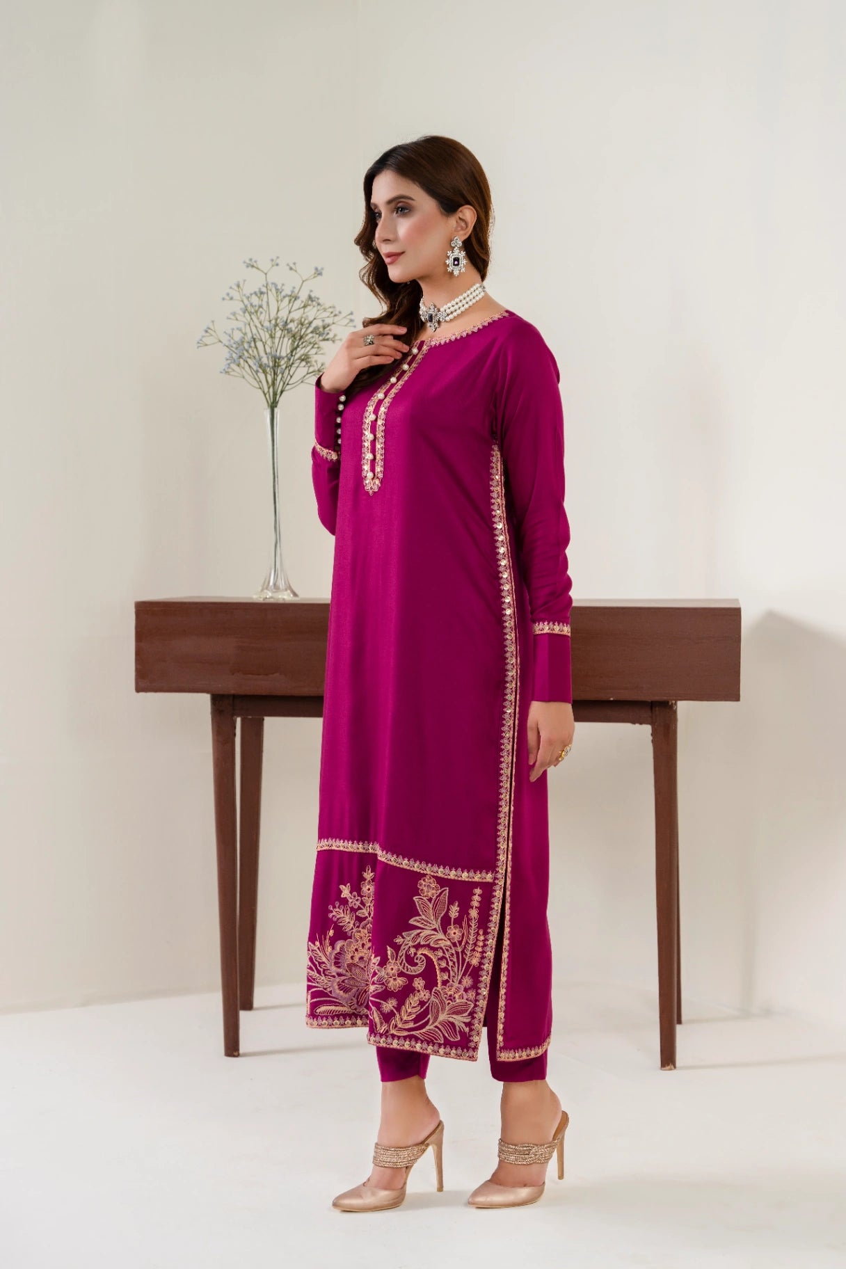 Additional Description: Straight Dyed Shirt With Embroidery. Round Neckline with peals & seqance . Full seleves with Emboridered border , cuff & pearls
