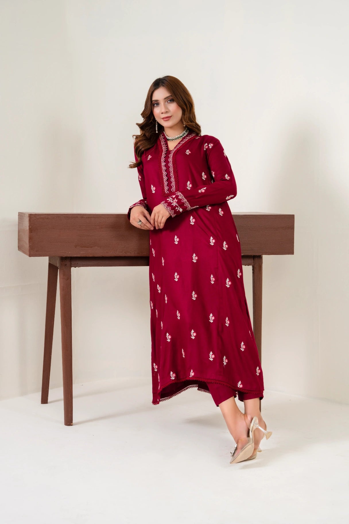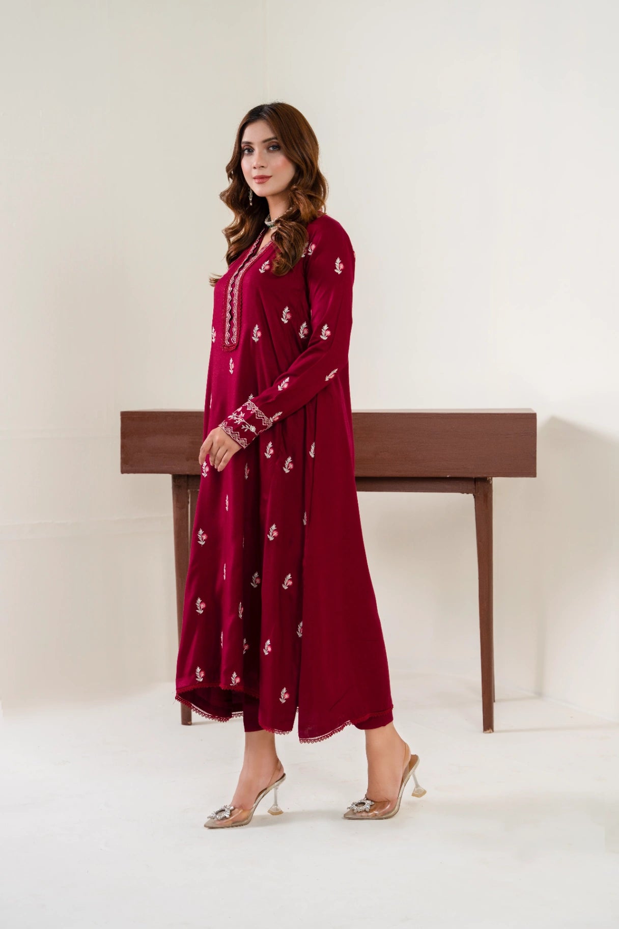 Additional Description: Aline Dyed Shirt With Embroidery. Round Neckline with embroidery & lace detailing . Full seleves with Emboridered border .
