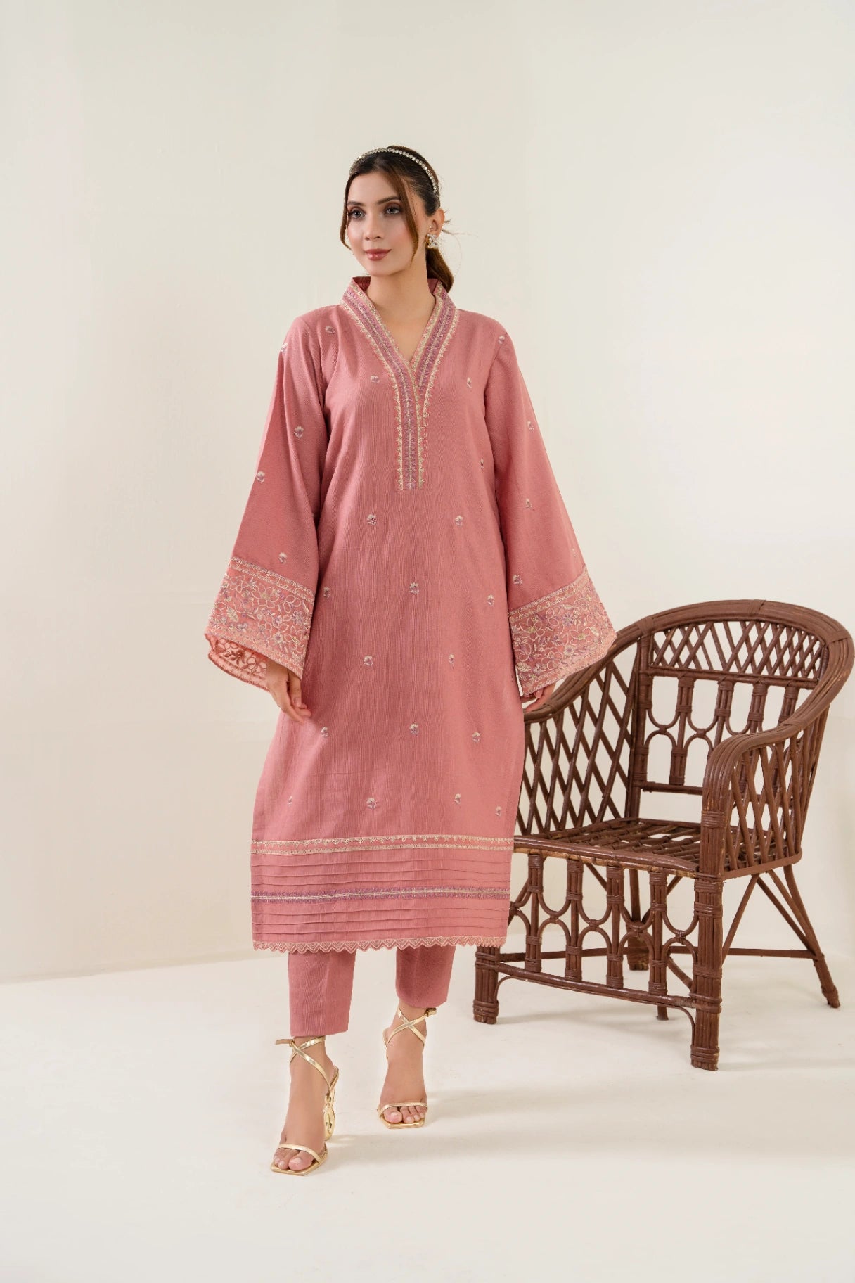 Additional Description: Straight Dyed Shirt With Embroidery. Emboridered Neckline with v cut . Full seleves with Emboridered border.