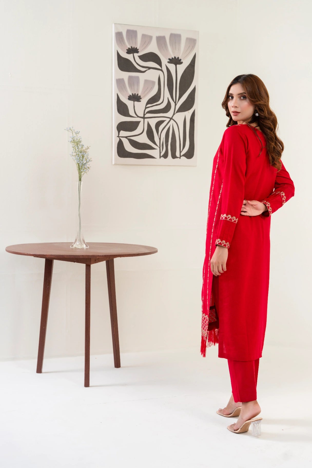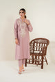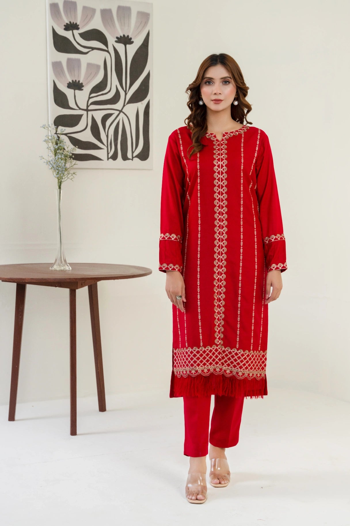 Additional Description: Front Open Dyed Shirt With Embroidery. Boat Neckline With V Cut .scalloped hem with thread fringes . Full Seleves with Embroidered & Pintax Details, Straight trouser