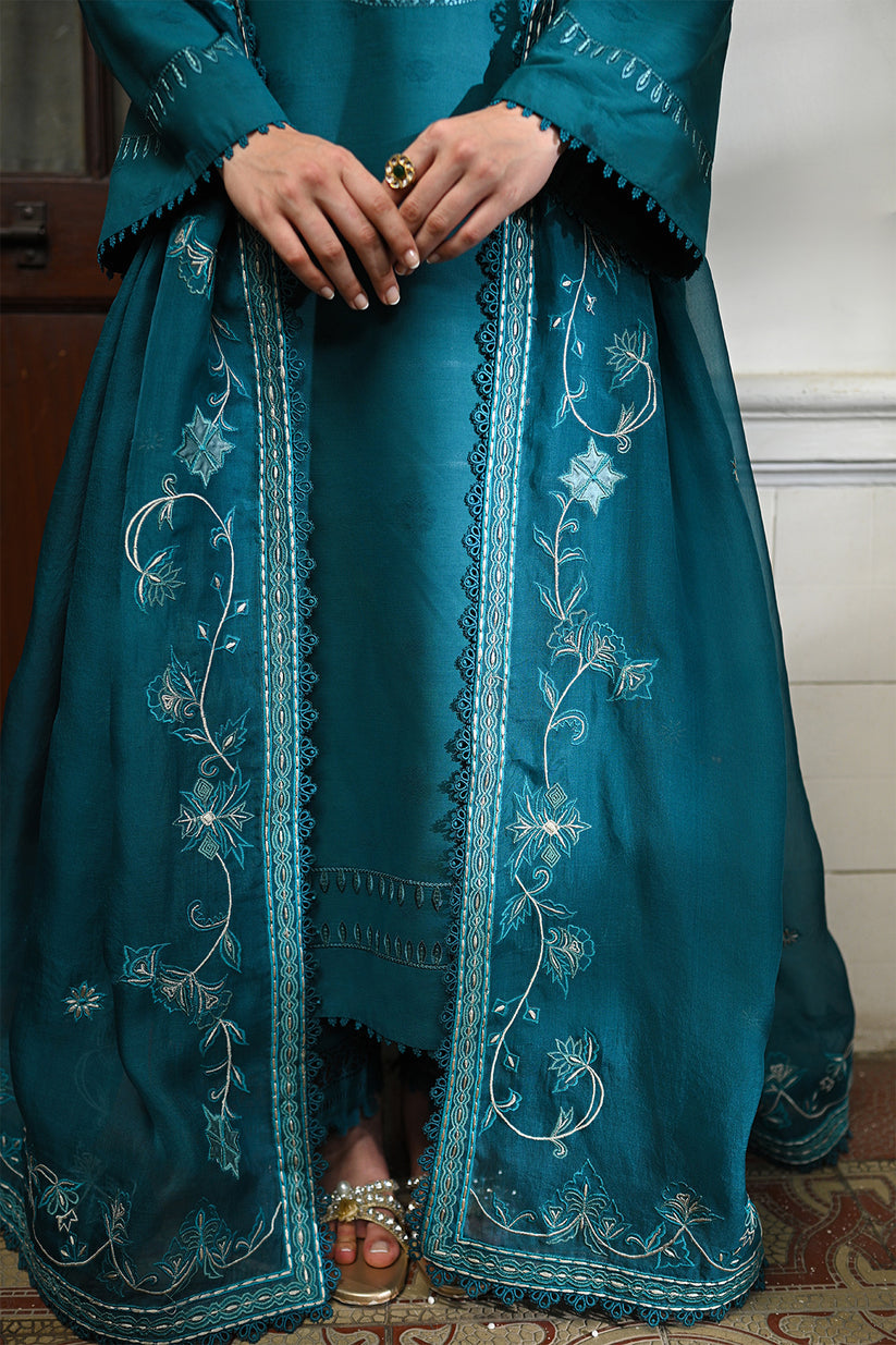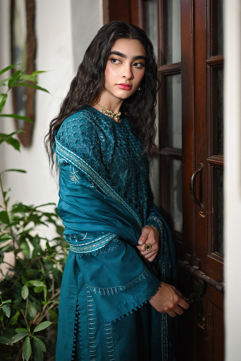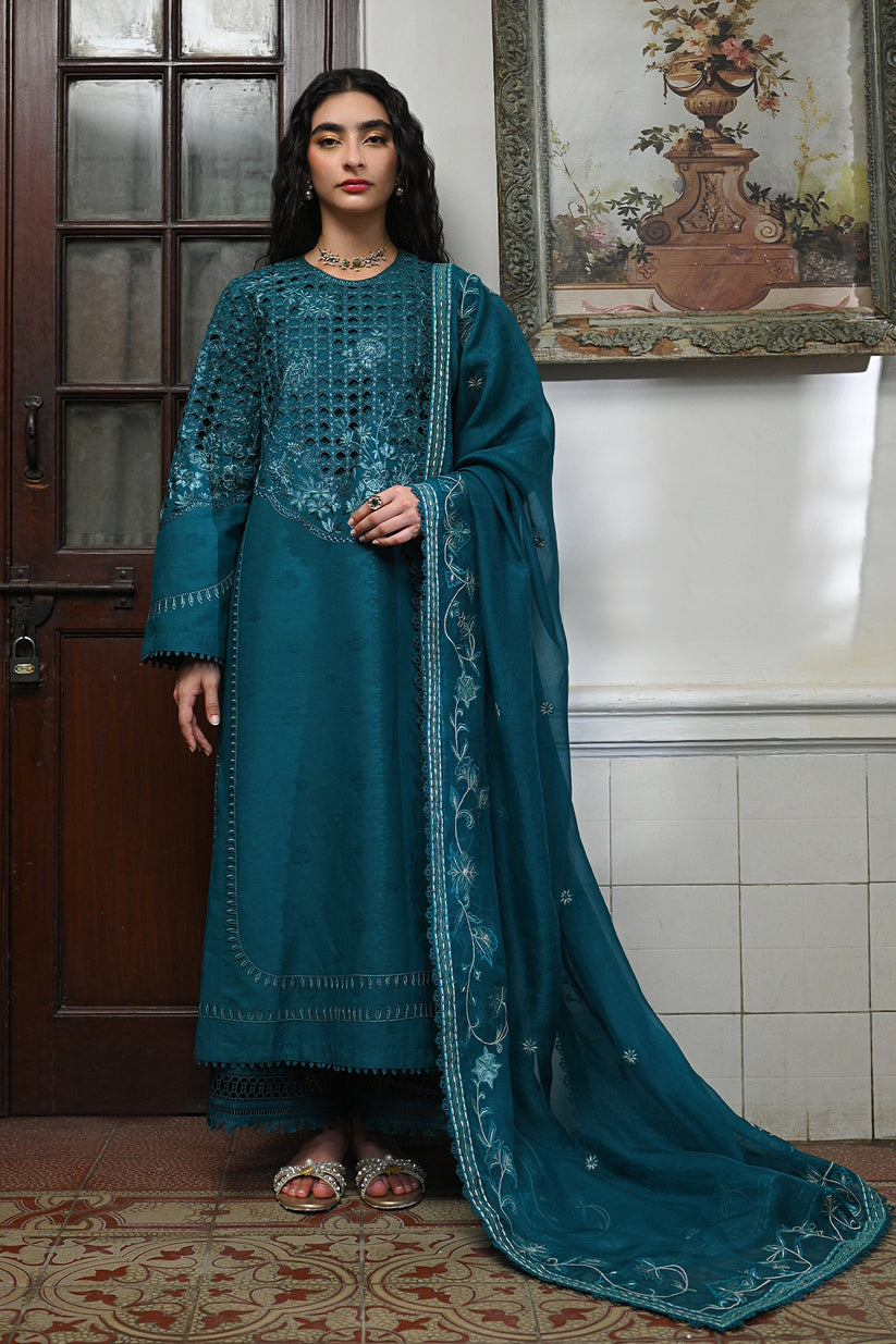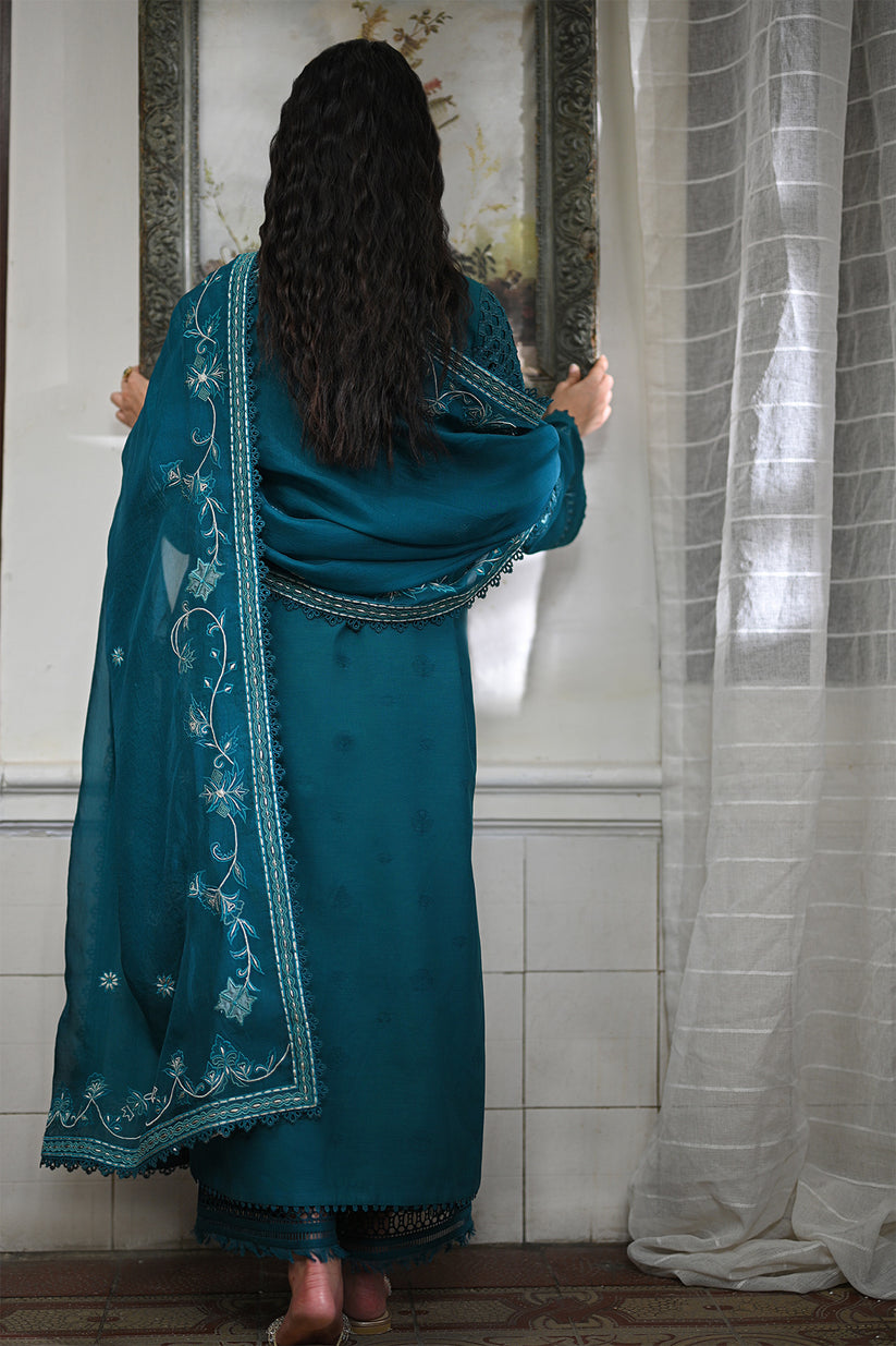 Introducing our exquisite Mid night green kurta, masterfully crafted with intricate cutwork and delicate embroidery that adds a touch of timeless grace. The ensemble is complemented by a stunningly embroidered dupatta, rich with elegant details, and lacey cutwork culottes that offer a perfect blend of style and sophistication.