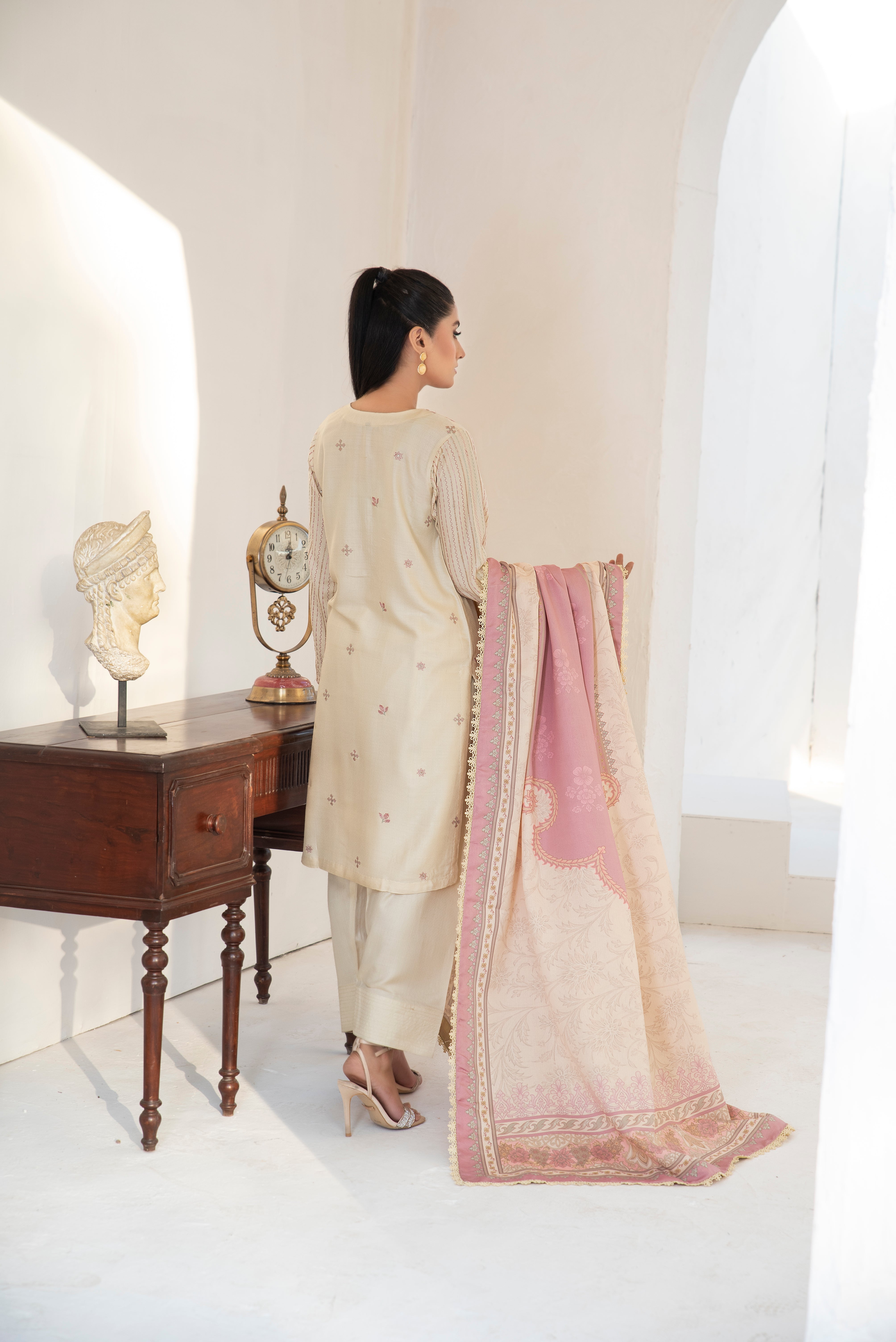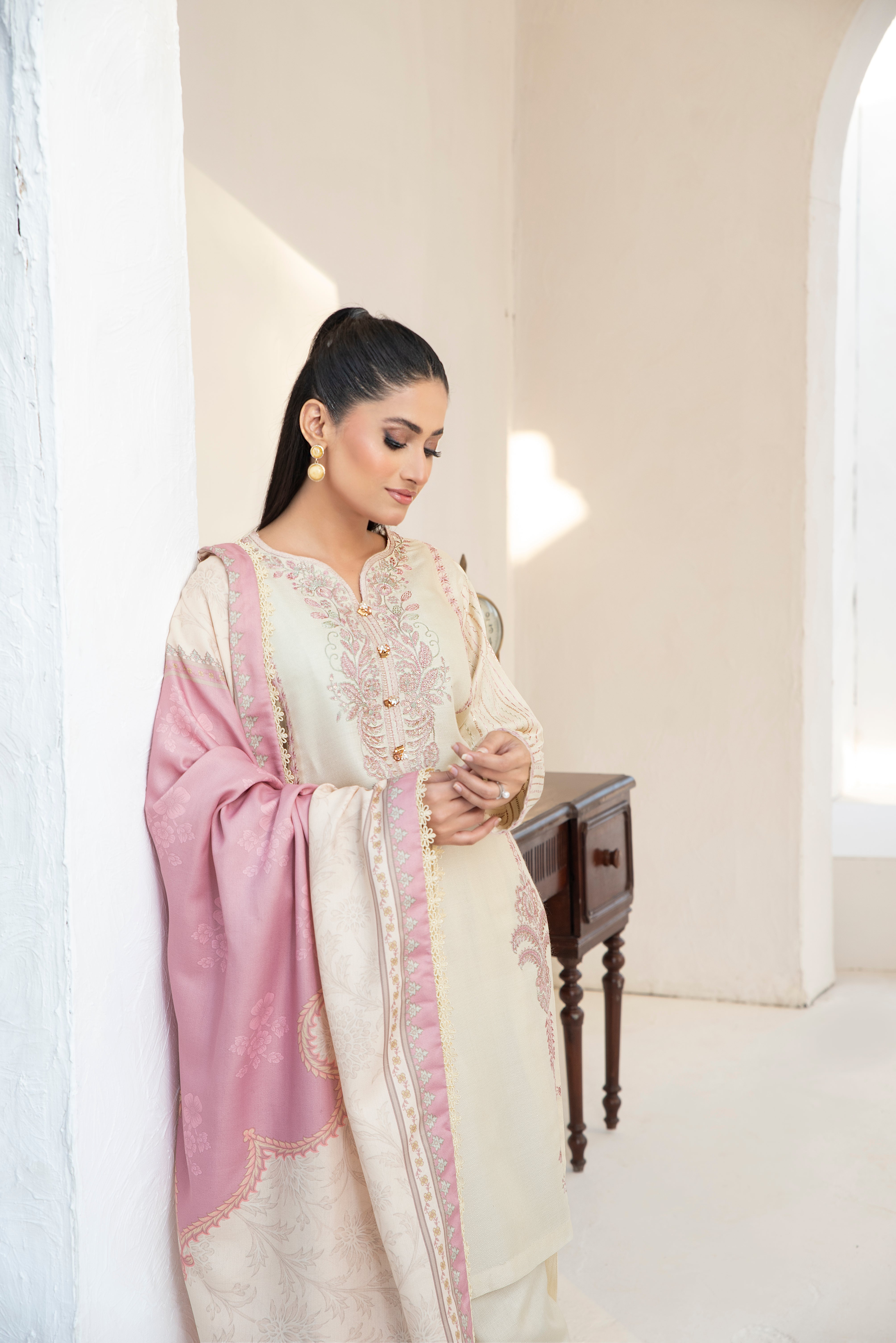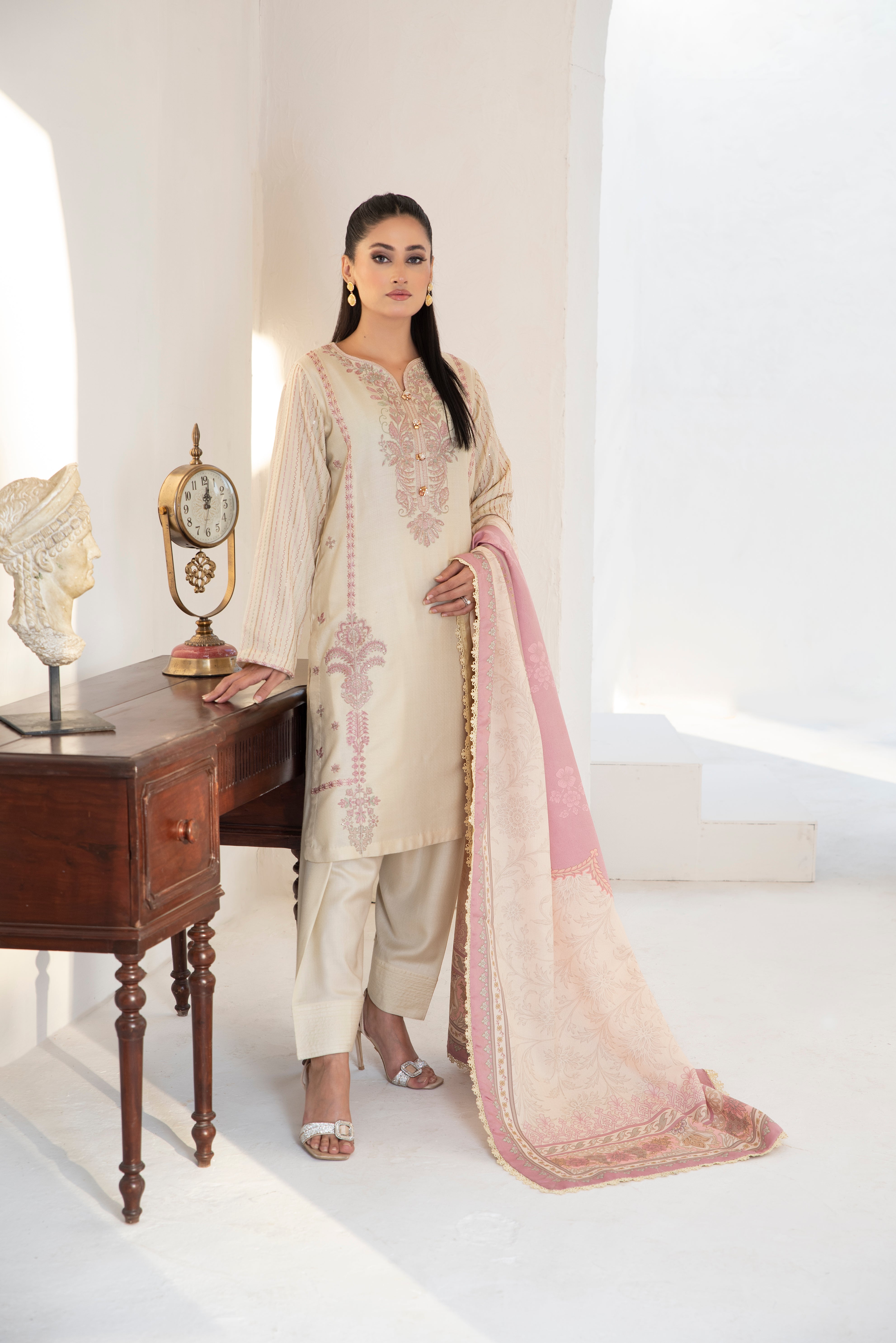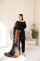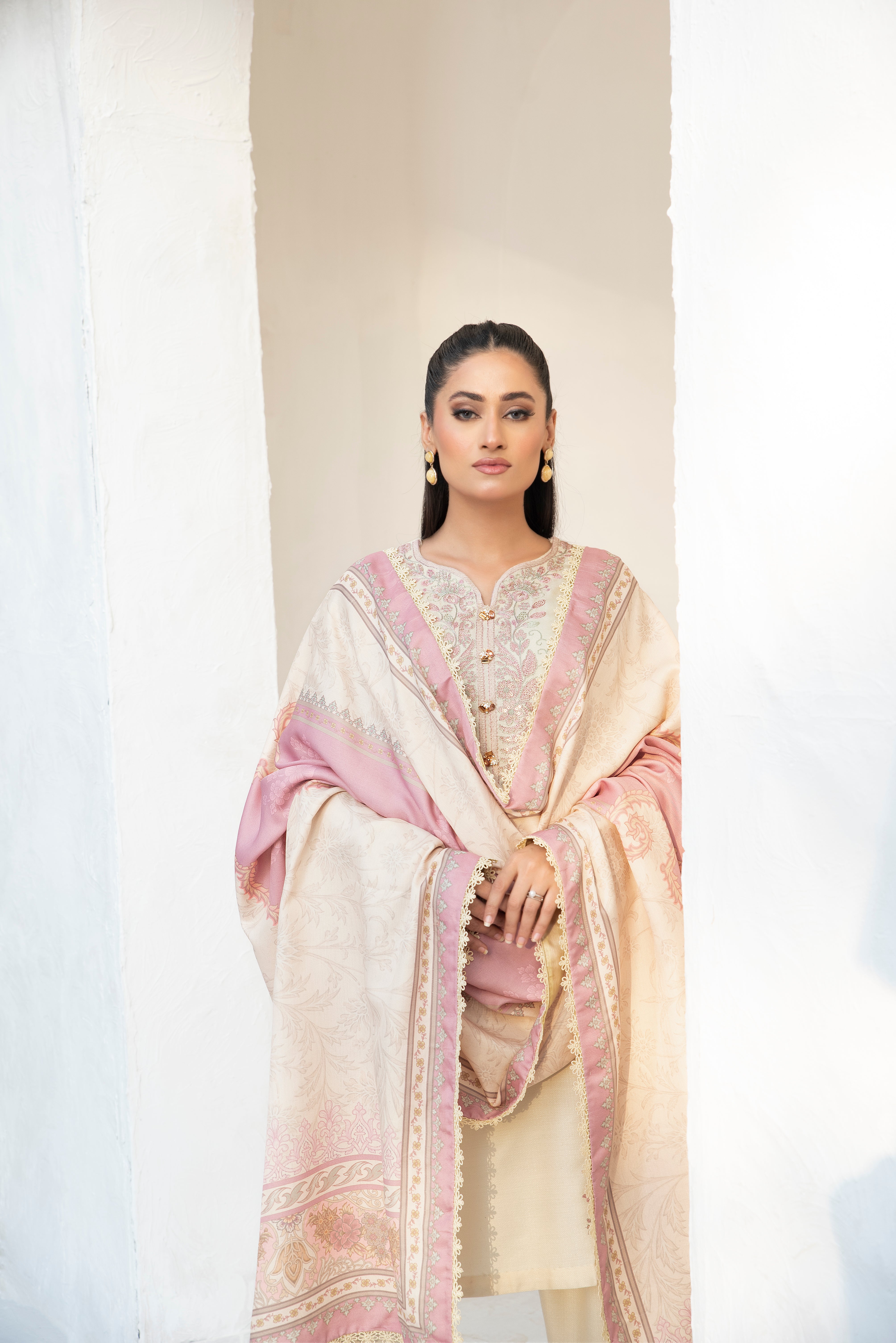 Nur. The most sophisticated pic from the collection, beautifully adorned with delicate embroidery patterns on a muted tone, making it a graceful winter attire. With a conventional design and family coloured prints on the twil shawl, wrapping you in ethnic elegance.