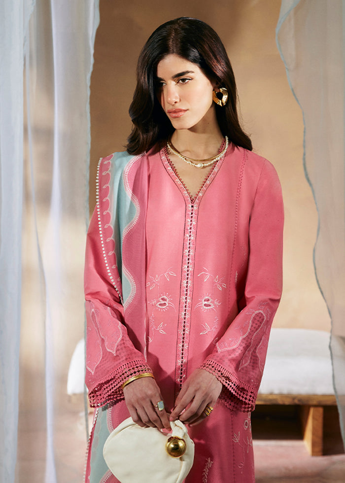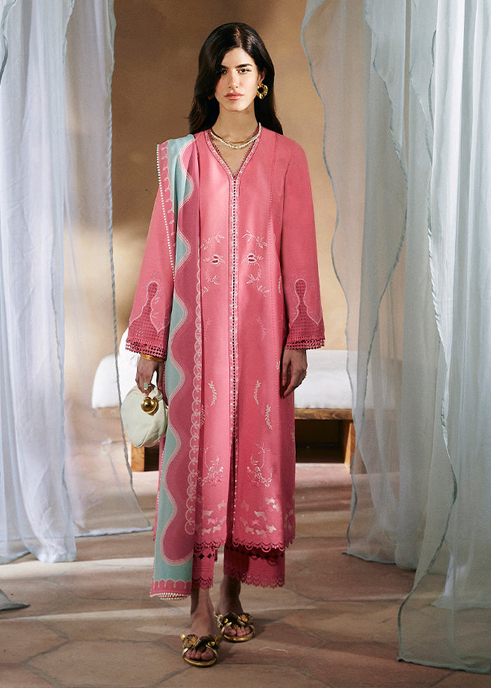 Salmon Rose Pink textured lawn, front open panelled a-line silhouett.