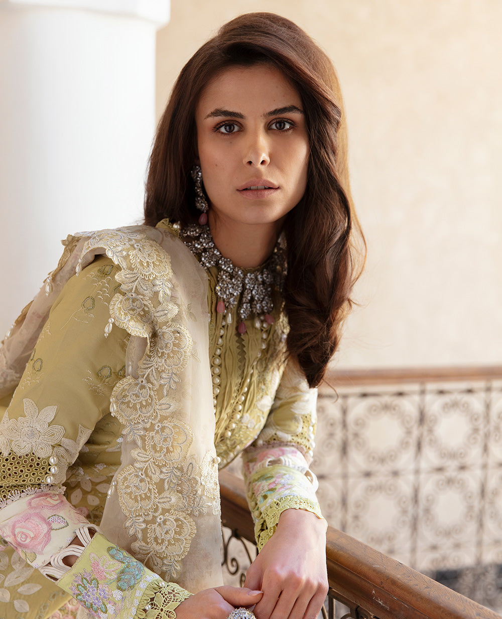 A lime green design that is luxuriously embellished with maze of dori, resham tankas, fine sequins, applique work with white sequin flower worked hem border. Featuring a captivating and artsy schiffli carving makes this design an unmatchable summer fashion statement. The printed organza dupatta is finely laced with floral organza borders.