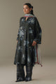 An off-white shirt inspired by the delicate florals found in Japanese pottery, paired with trousers in soothing teals and grays featuring a subtle check print. The look is completed with an off-white shawl adorned with refined paisley motifs, creating a soft, balanced, and artfully composed ensemble.