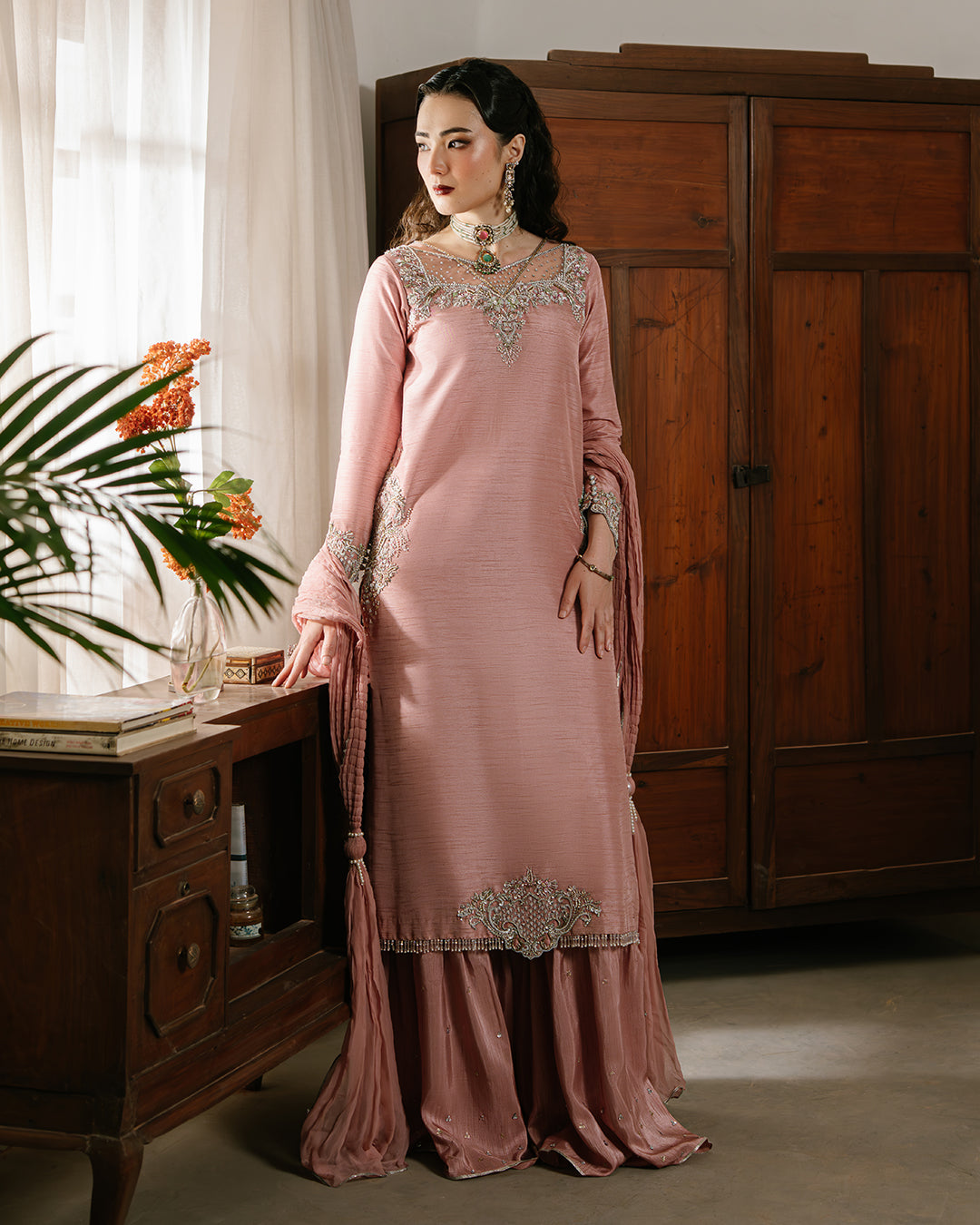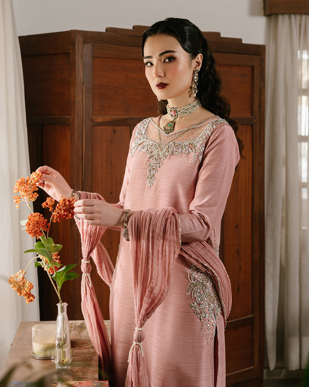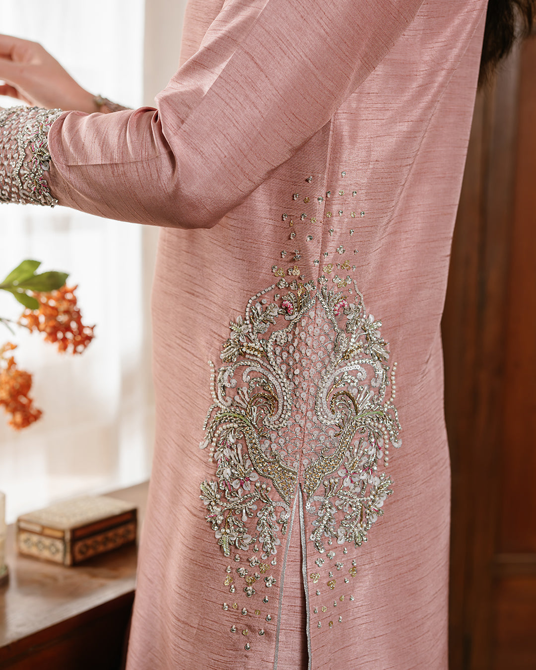 Delicate and effortlessly graceful, this Pastel Pink ensemble is a tribute to timeless femininity and understated luxury.