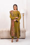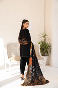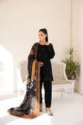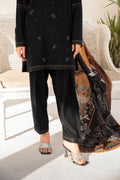 ?Estelle. The black wollen fabric serves as a perfect canvas meticulously crafted geometric embroidery in shades of black and gold with the estelle sequence. With a mustard contrast twil shawl with floral digital prints which is finished with lace.