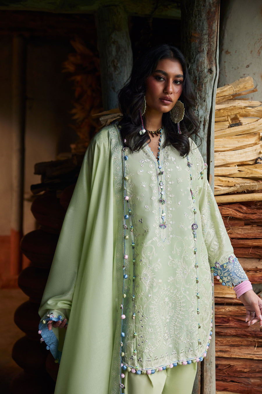 Paired with a woven checkered cotton net dupatta, the look floats with airy elegance, sheer, weightless, and refined. Yùlù is a study in serene opulence, fresh as dawn, composed as jade, and effortlessly radiant.