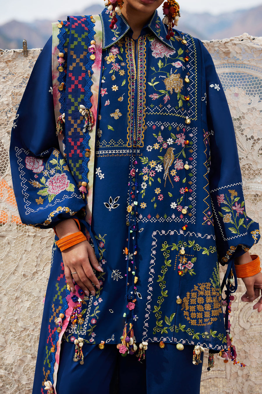 Paired with a sheer voile dupatta in matching midnight tones, the ensemble drapes effortlessly, bringing fluid movement and graceful balance.