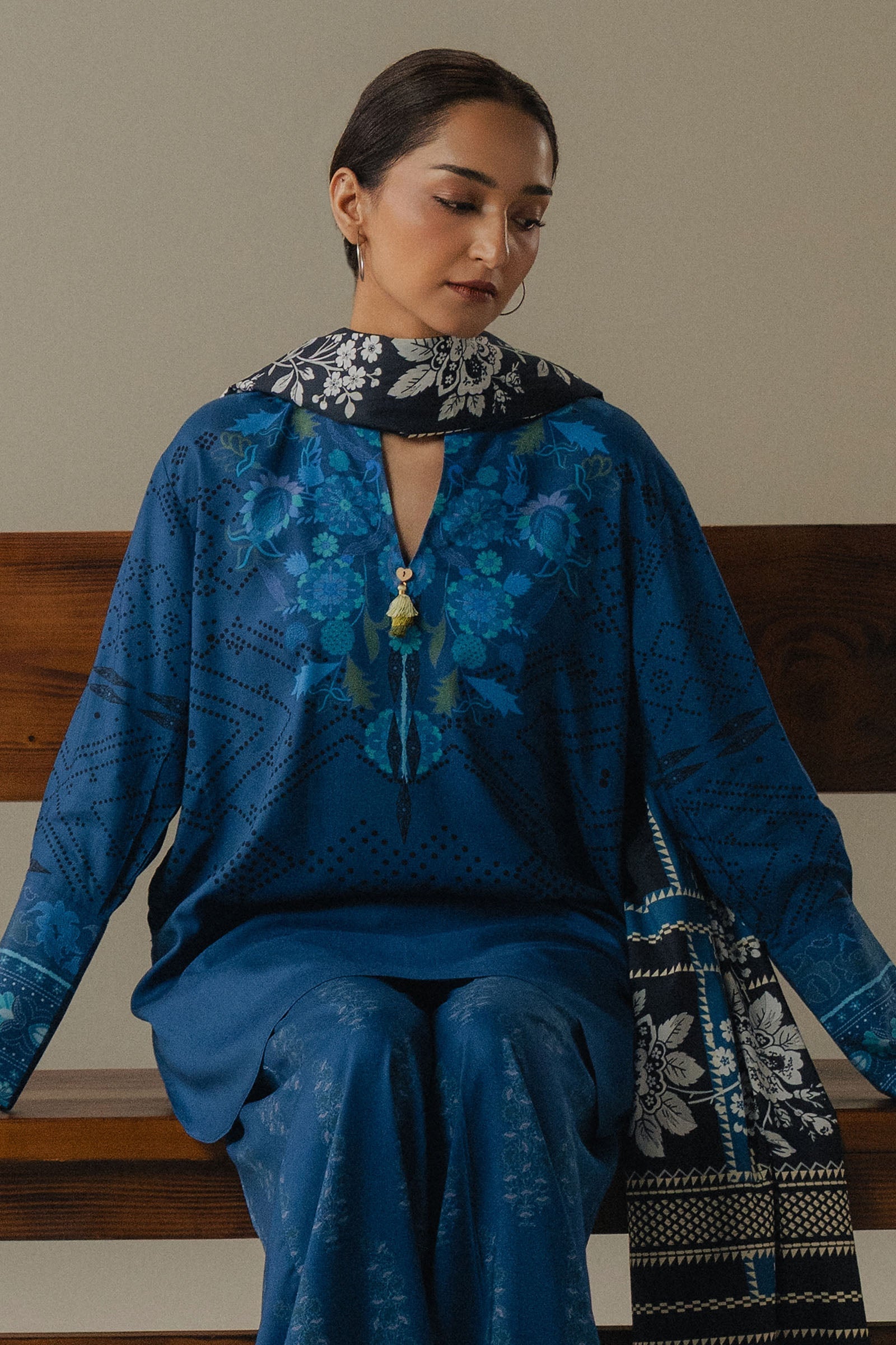 A cobalt blue shirt inspired by traditional Bandhani and Kalamkari artistry, paired with matching cobalt blue trousers featuring delicate block print booti motifs. The ensemble is finished with a black and gray checked shawl, adding a contemporary contrast to the vibrant tones and intricate details of the outfit.