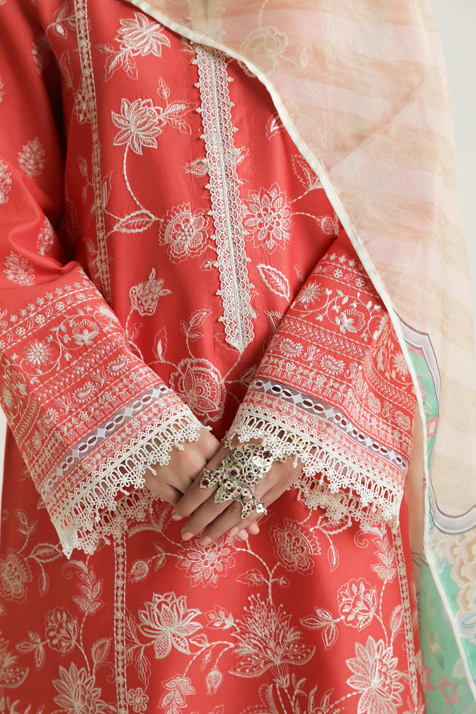 Rendered in modern pastels, Mahi blooms in a beautiful all over foliage embroidered shirt, printed cambric pants and beautifully printed silk dupatta.