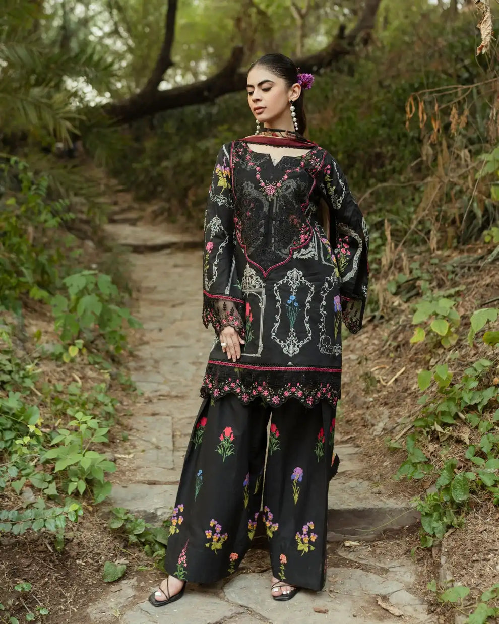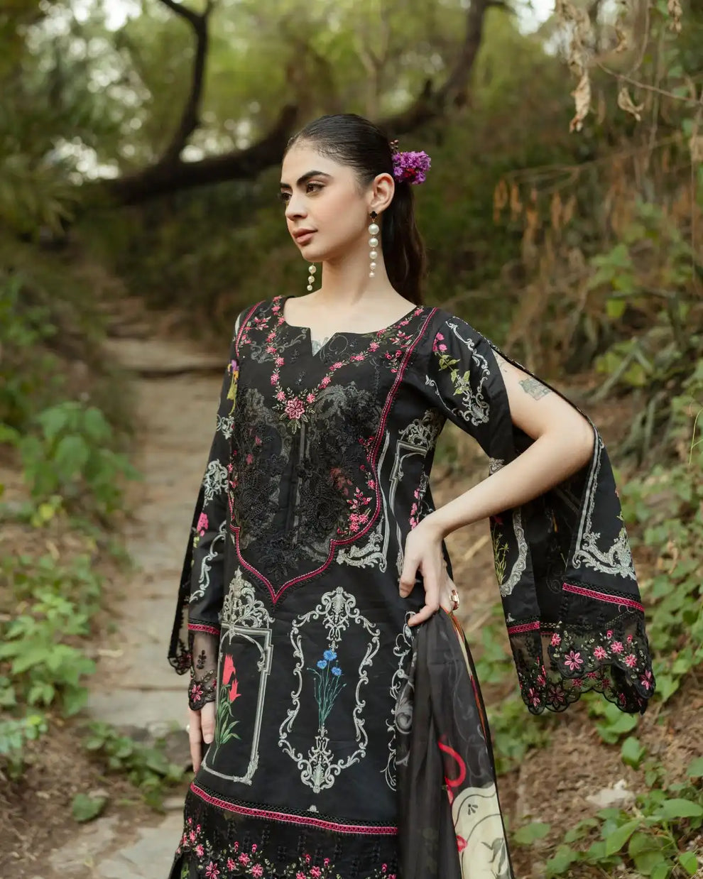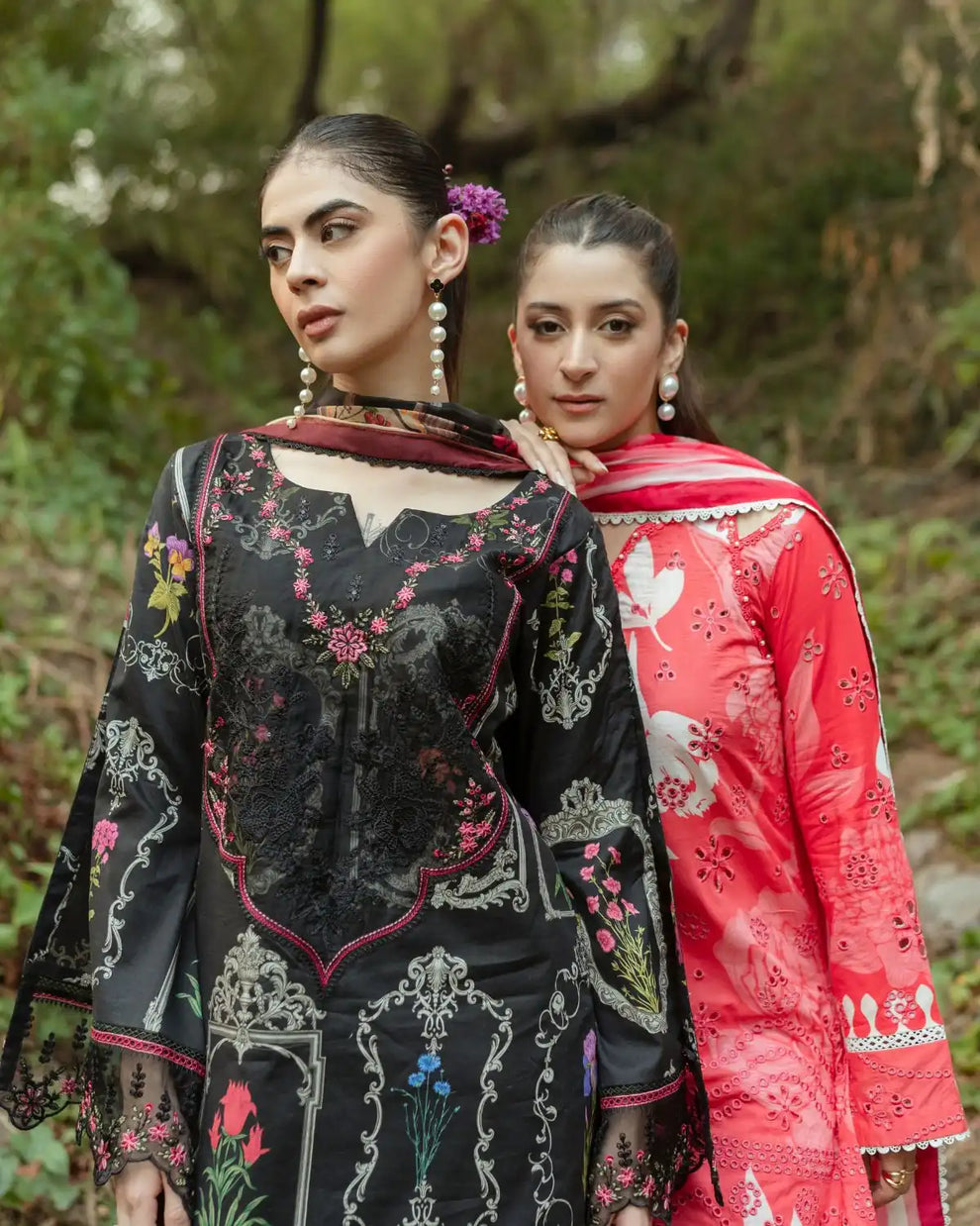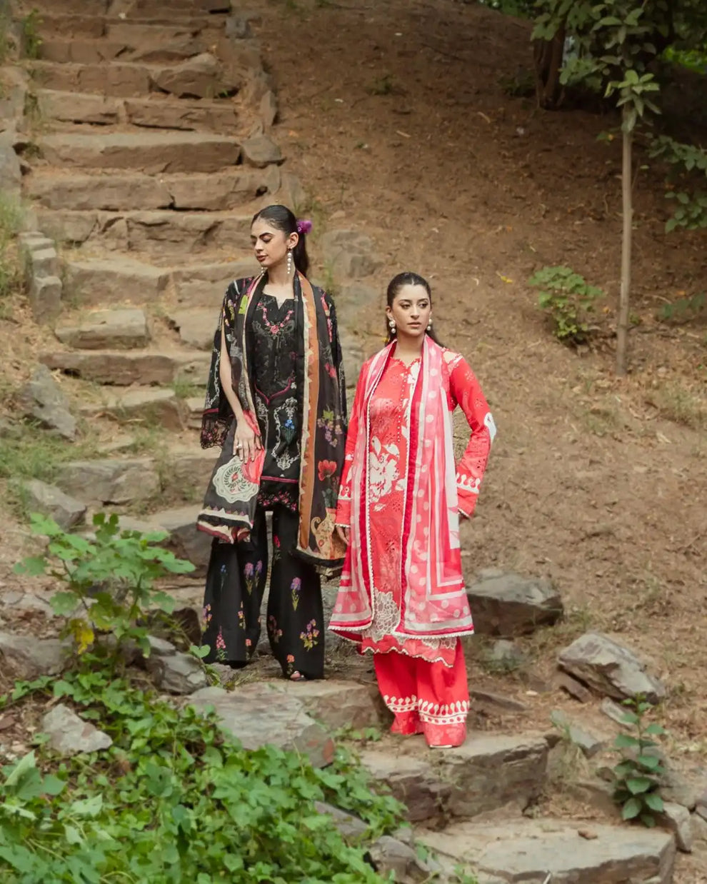 Inspired by Ixora blossoms, this airy lawn dress in coral, sunset red, and salmon features delicate floral embroidery and a breezy farshi shalwar. Paired with a silk digital printed dupatta finished with lace and organza embroidered patches, it radiates warmth, grace, and effortless summer charm