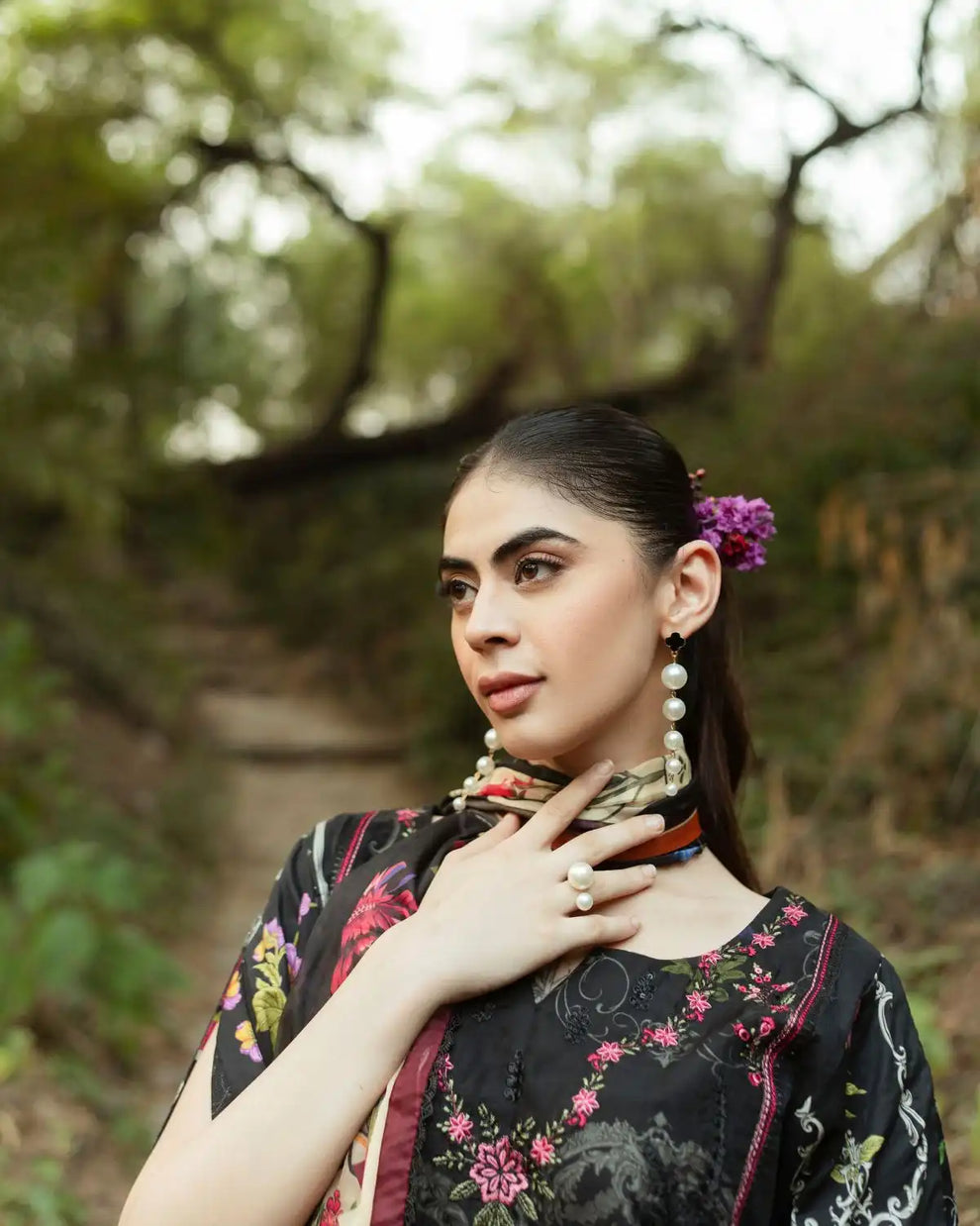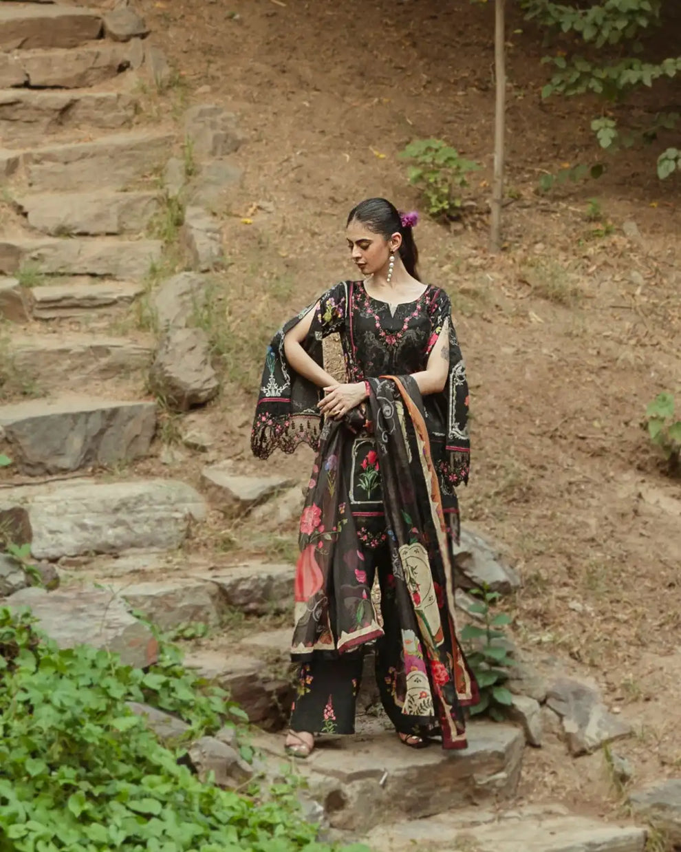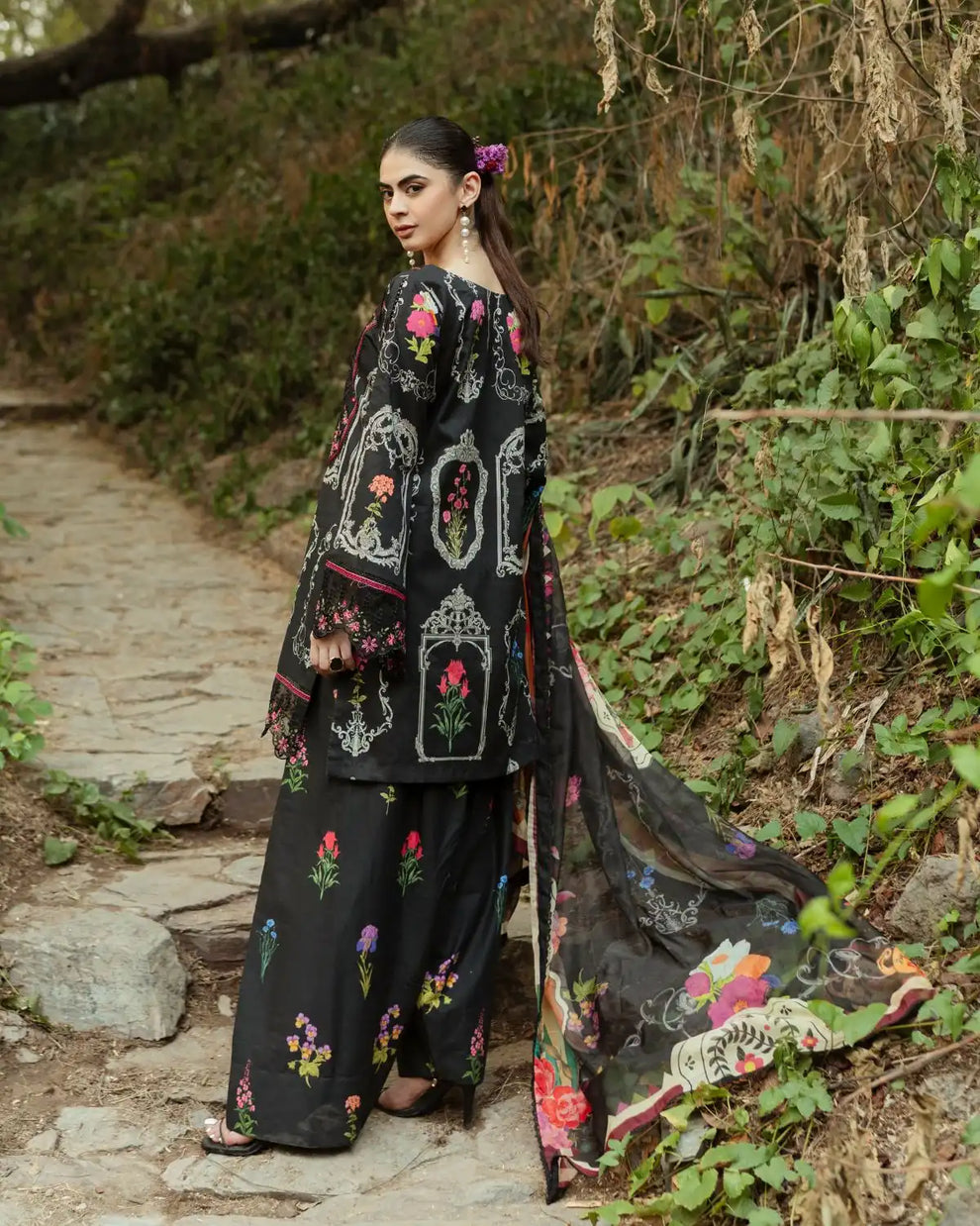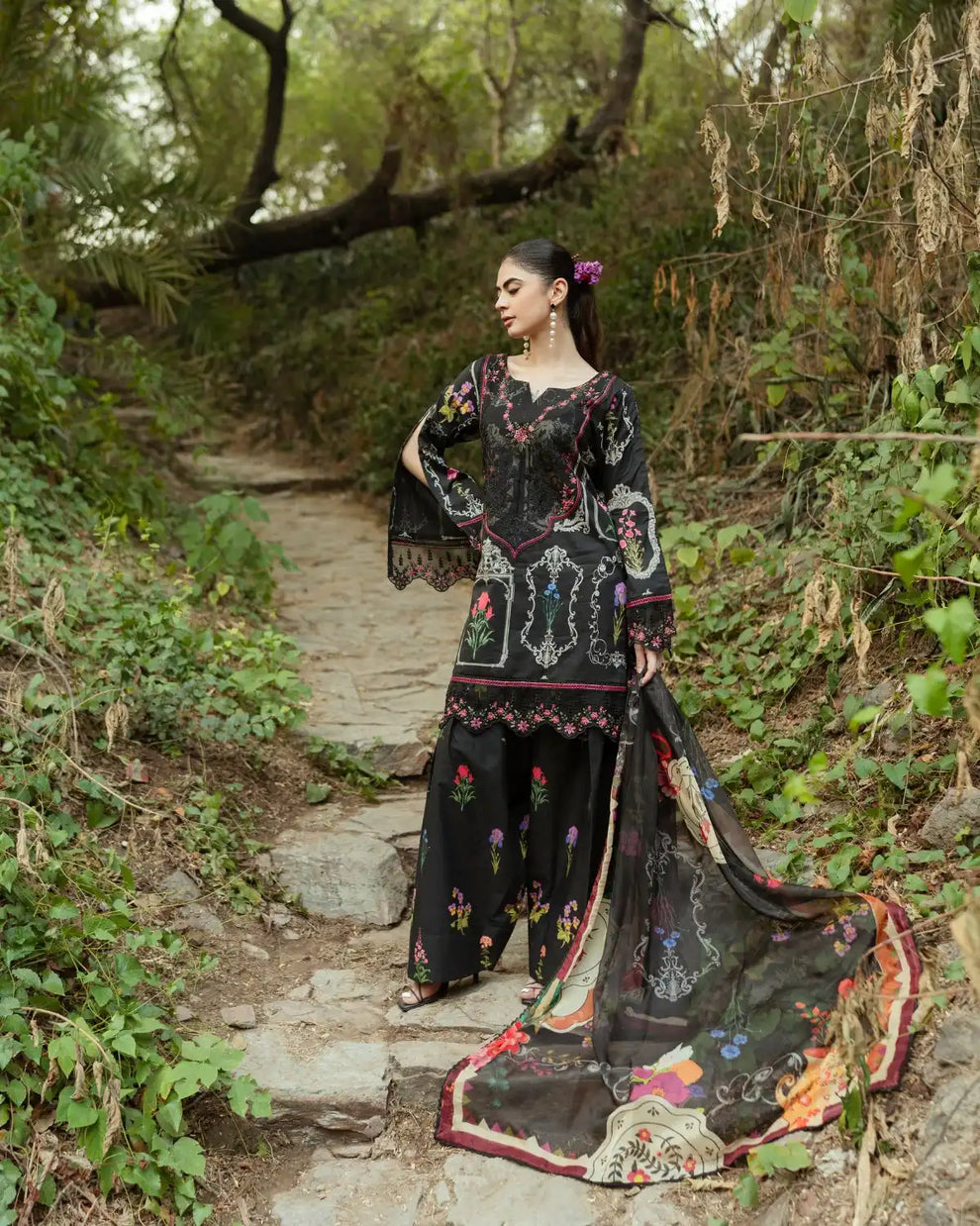 Inspired by Ixora blossoms, this airy lawn dress in coral, sunset red, and salmon features delicate floral embroidery and a breezy farshi shalwar. Paired with a silk digital printed dupatta finished with lace and organza embroidered patches, it radiates warmth, grace, and effortless summer charm