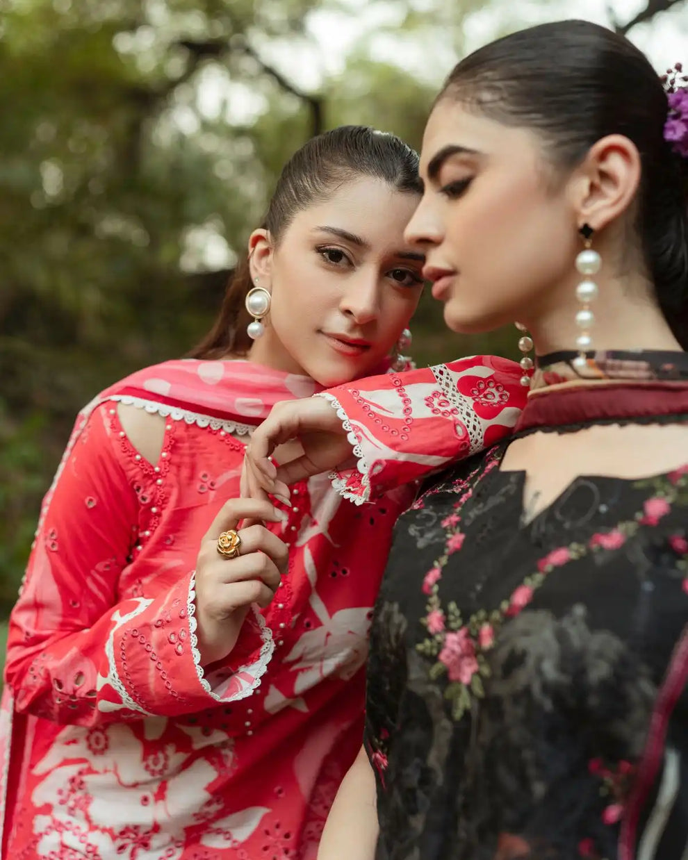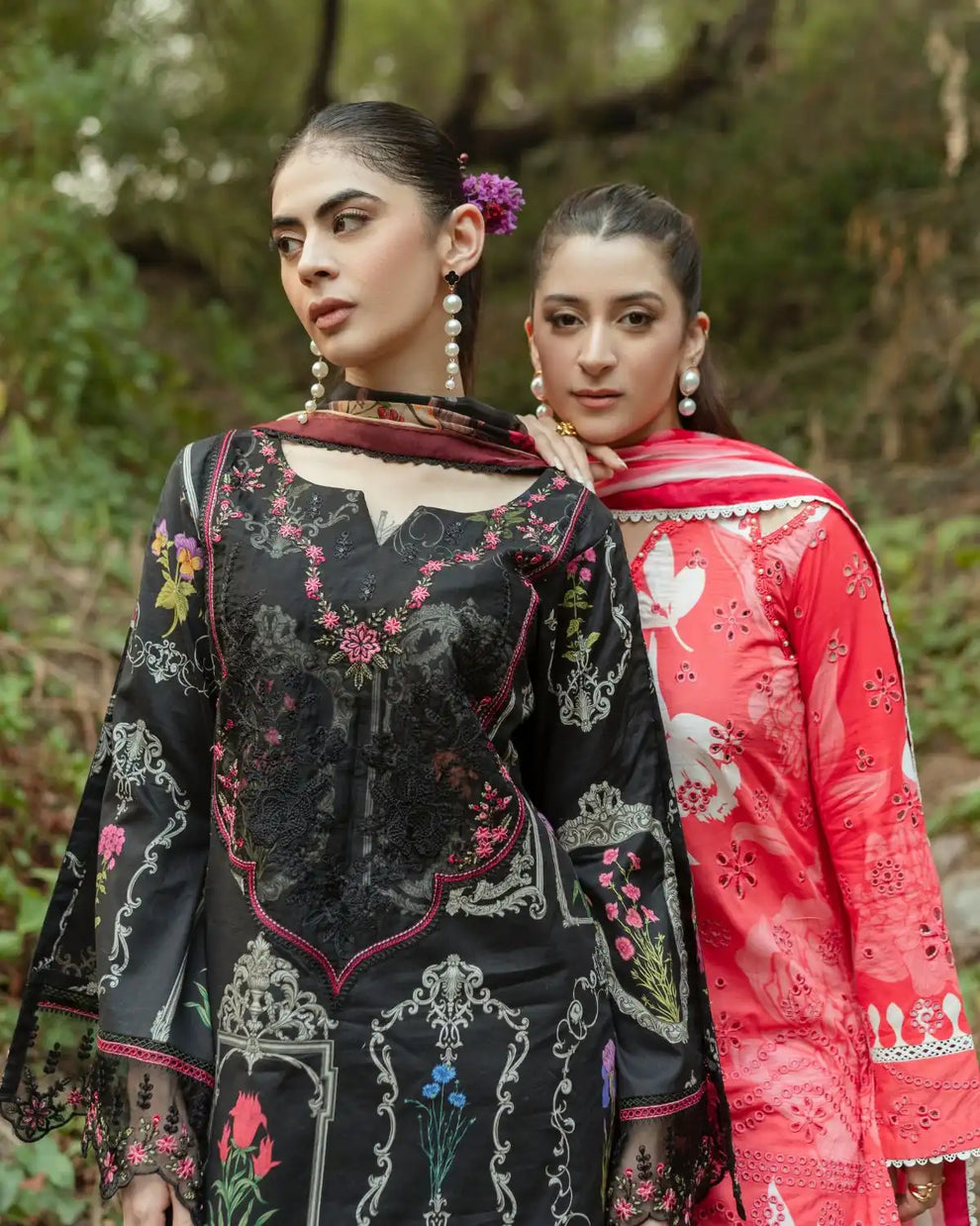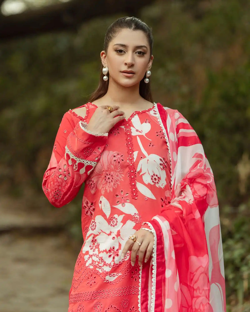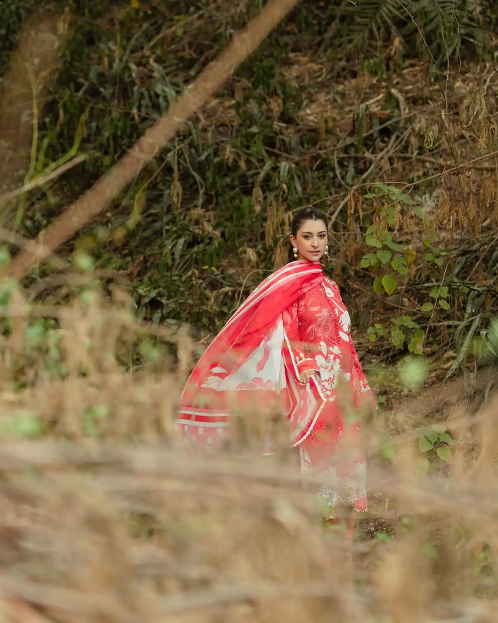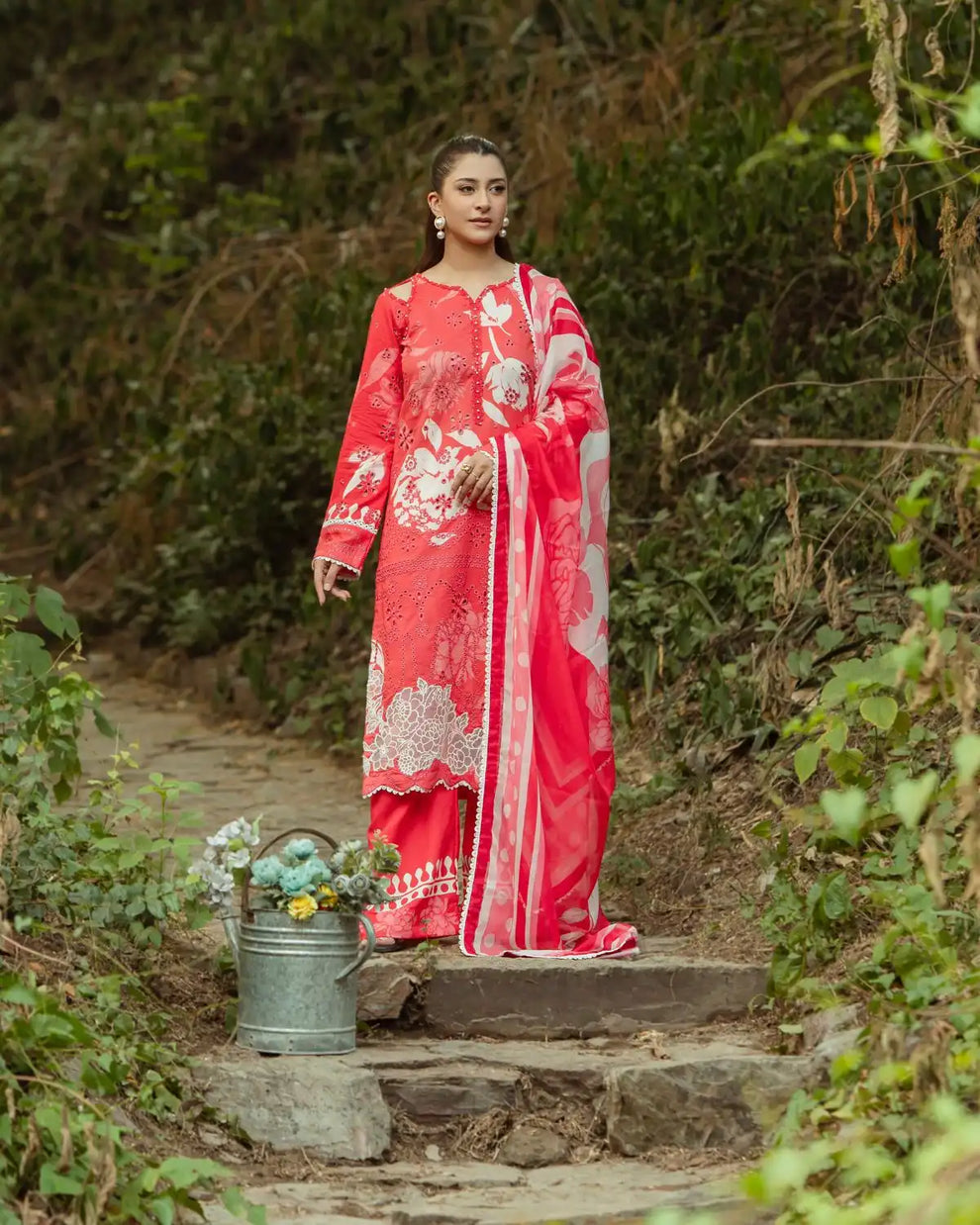 Inspired by Ixora blossoms, this airy lawn dress in coral, sunset red, and salmon features delicate floral embroidery and a breezy farshi shalwar. Paired with a silk digital printed dupatta finished with lace and organza embroidered patches, it radiates warmth, grace, and effortless summer charm.