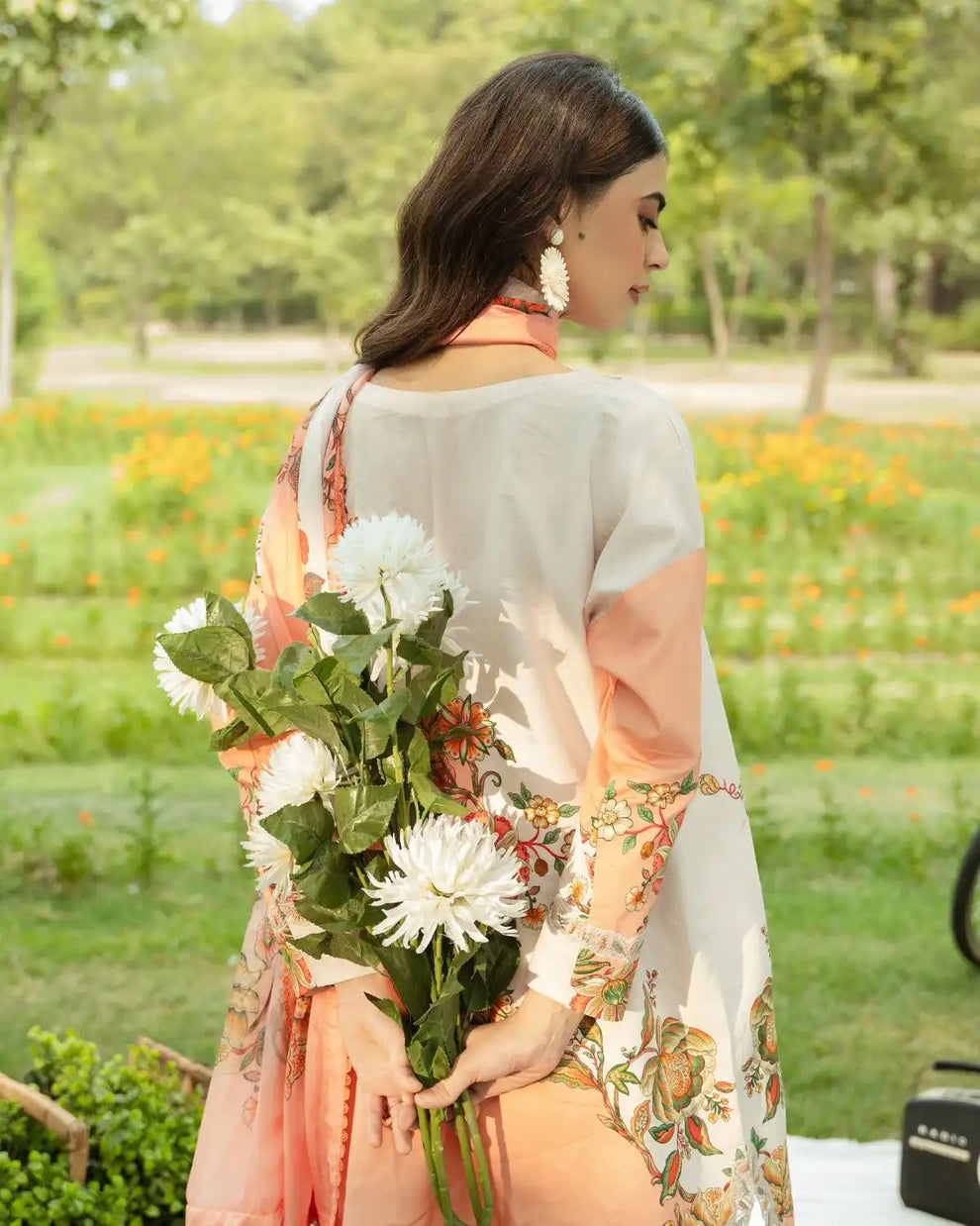 This elegant suit features a warm-toned floral print with peach, orange, and green botanical elements on a soft base. The design is thoughtfully placed across the shirt and sleeves, paired with a chiffon dupatta for a cohesive look. Delicate organza patchwork with minimal embroidery and pearl embellishments adorns the neckline, sleeves, and hem for a refined finish