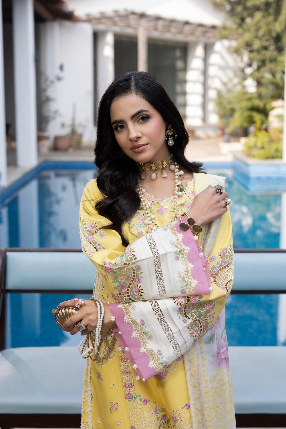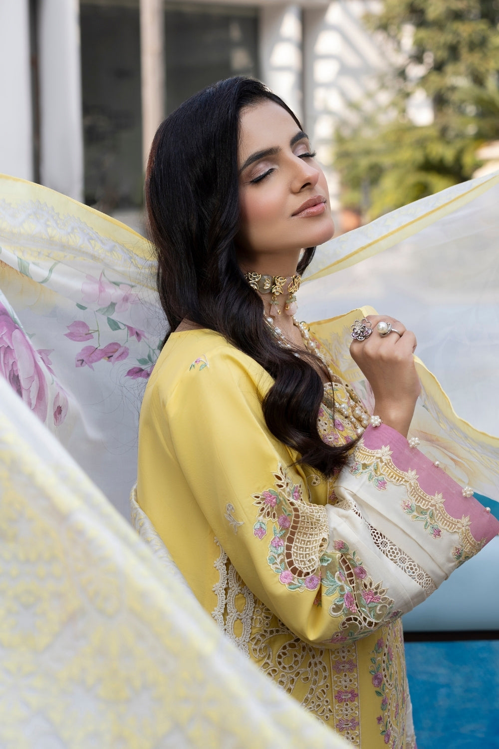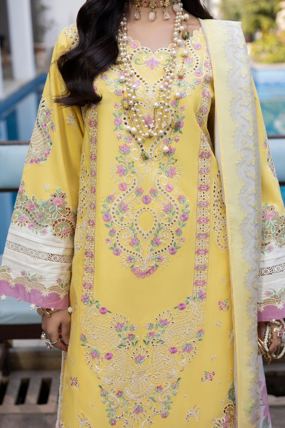 A brilliant lime yellow unstitched lawn fit, detailed with machine embroidery and Chikankari shirt. Complementing the look is a lawn dyed trousers and a printed silk dupatta.