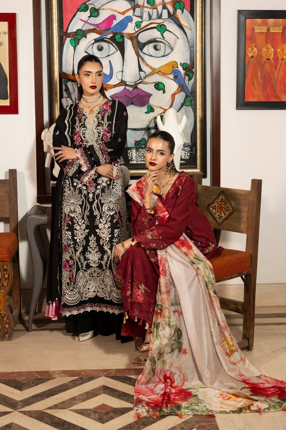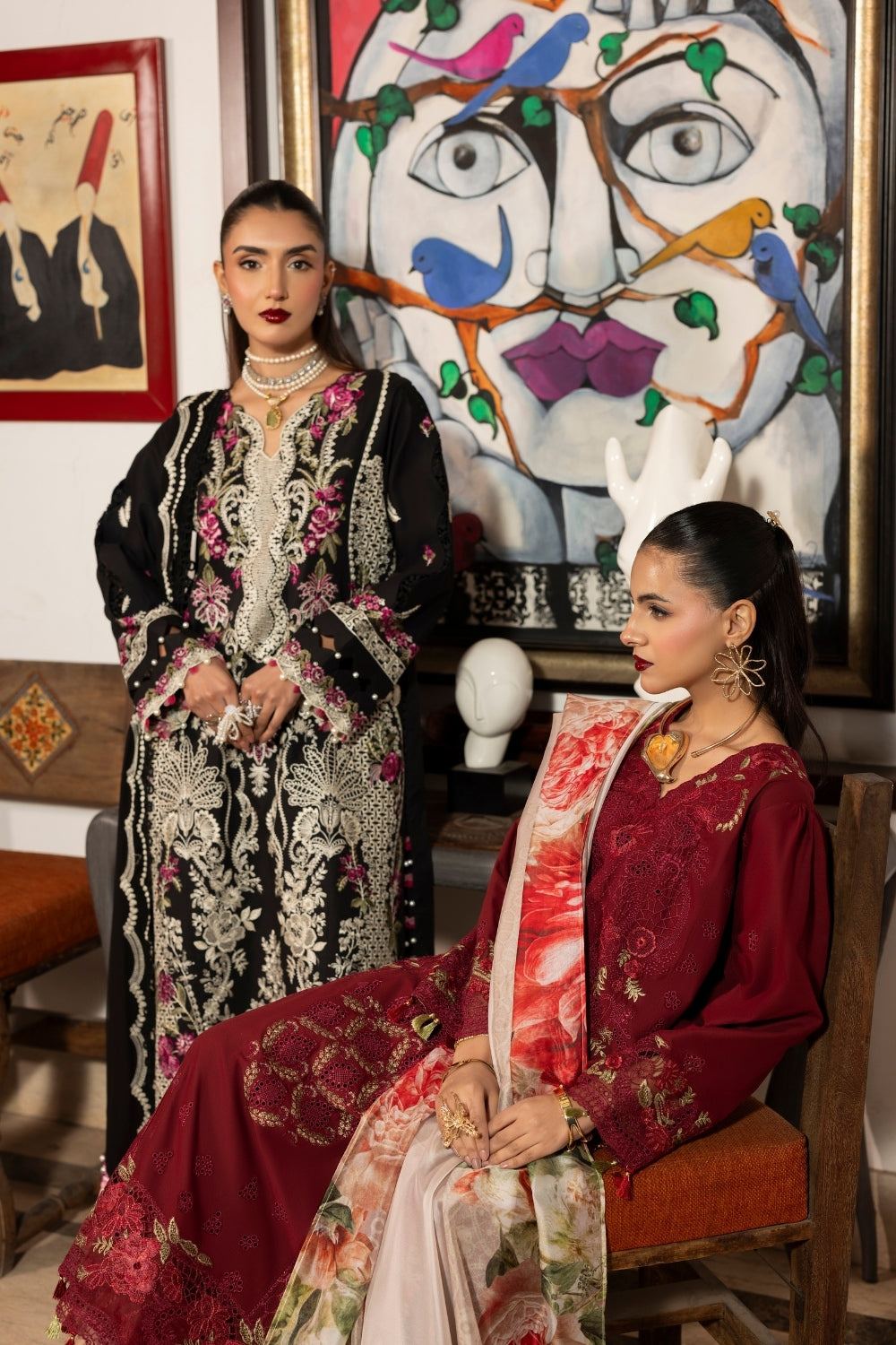Intricate embroidered chikankari details on the front, side panels, and sleeves, beautifully complemented by organza borders. It is paired with a dyed cambric trouser and an embroidered chiffon dupatta, offering a refined and luxurious look.