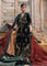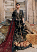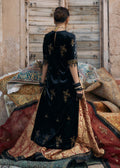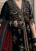 A luxurious, open-front shirt crafted from black shimmer velvet and intricately embellished with crystal-cut beads and Swarovski crystals. The design showcases a pattern-aligned dabka edging, with layers of meticulously placed baitki in a crane motif. The gown is adorned with short sleeves, each accented by long, black tassels for a touch of drama. Paired with it are three-panel jamawar azaar pants, featuring a black shimmer velvet base with delicate embroidery. The ensemble is completed by an embroidered organza dupatta, framed by a four-sided velvet border.