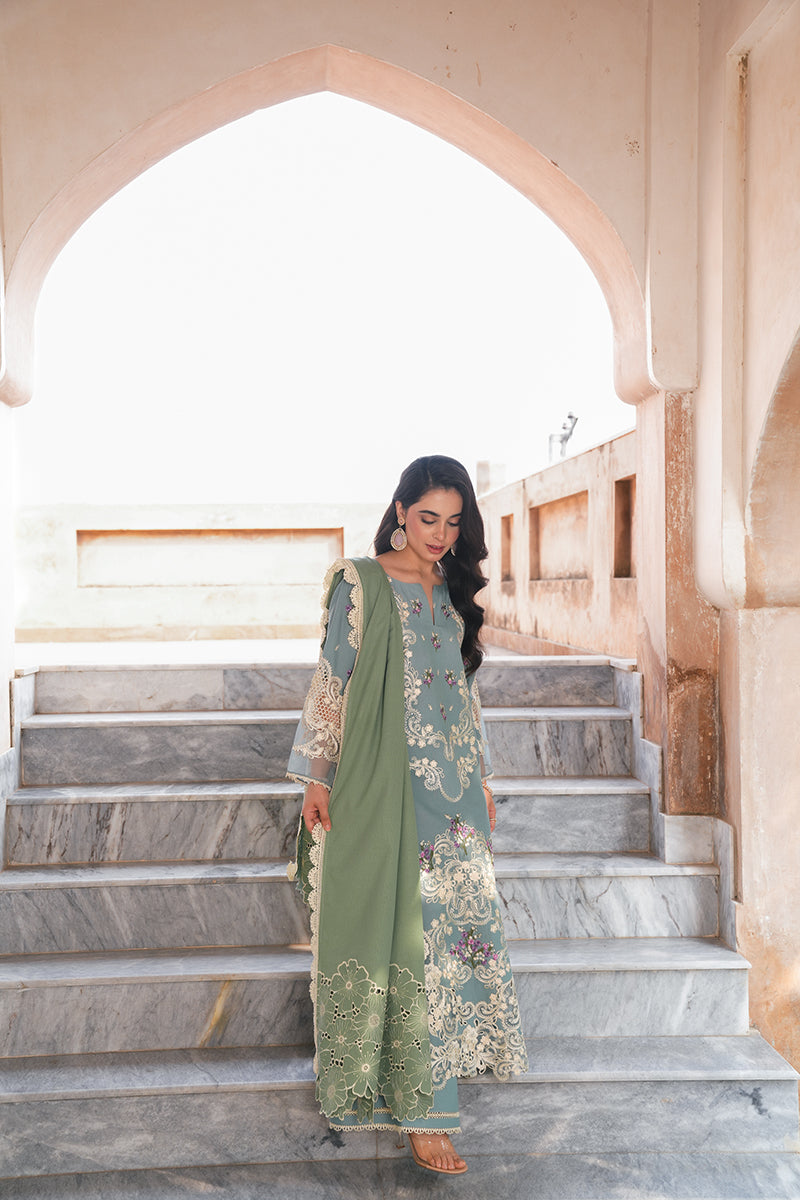 Immerse yourself in regal elegance with "Nisa," a three-piece karandi silhouette on a grey canvas. The shirt showcases exquisite purple, green, and cream embroidery across the whole canvas, paired with matching trousers and a contrasting green dupatta with cutwork pallus, making this ensemble a true work of art.