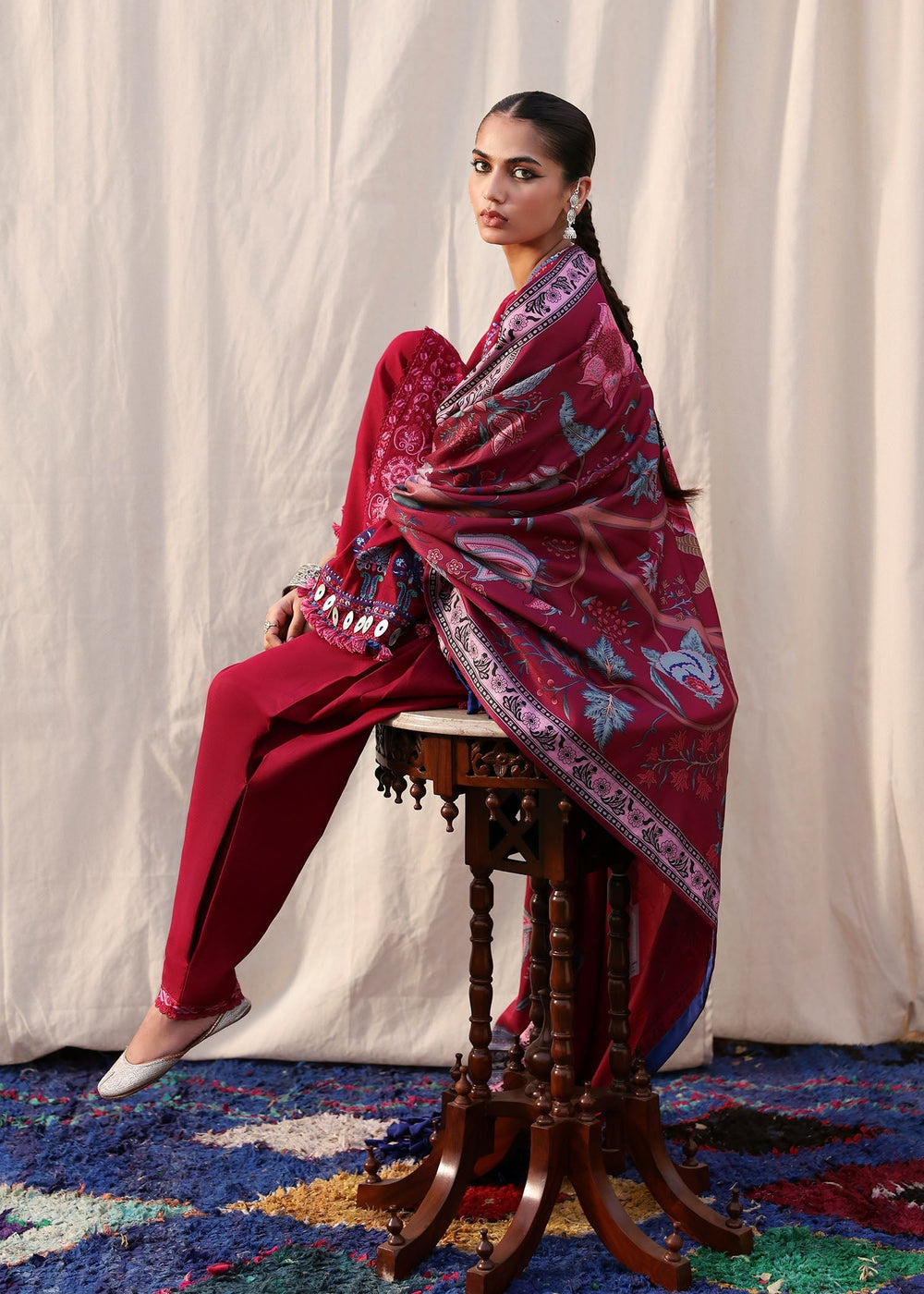 Set against a striking cranberry khaddar base, the Turkish-inspired embroidery lends character, colour and dimension. A standout winter look that celebrates detail, heritage, and confident style. Paired with matching trousers and a double sided printed shawl showcasing an exquisite tree or life motif , this statement winter look balances tradition and modern elegance.