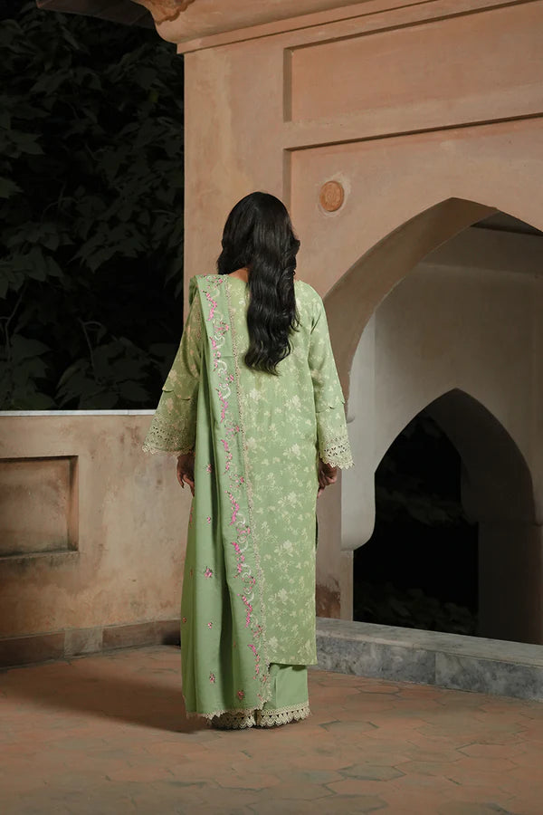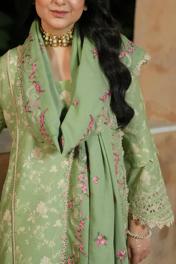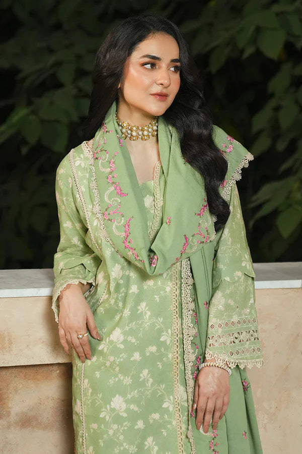 Anaya opens the door to glamour, a 3-piece Karandi set layered in lavender hue with a subtle vintage rosette print and creme cutwork embroidery layered on top of the shirt. Paired with matching trousers and a solid karandi dupatta with embroidered floral sprays and bordered edges all around, it’s a refreshing take on seasonal style.