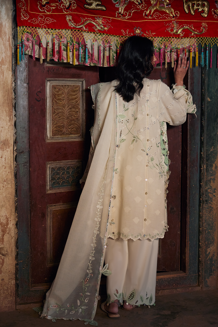 A vision of serene elegance, this ivory-cream ensemble embodies effortless femininity with artisanal charm. The luminous canvas is adorned with delicate floral and botanical embroideries, now touched with soft light green accents that breathe freshness into the design, while intricate threadwork traces the neckline with subtle precision.