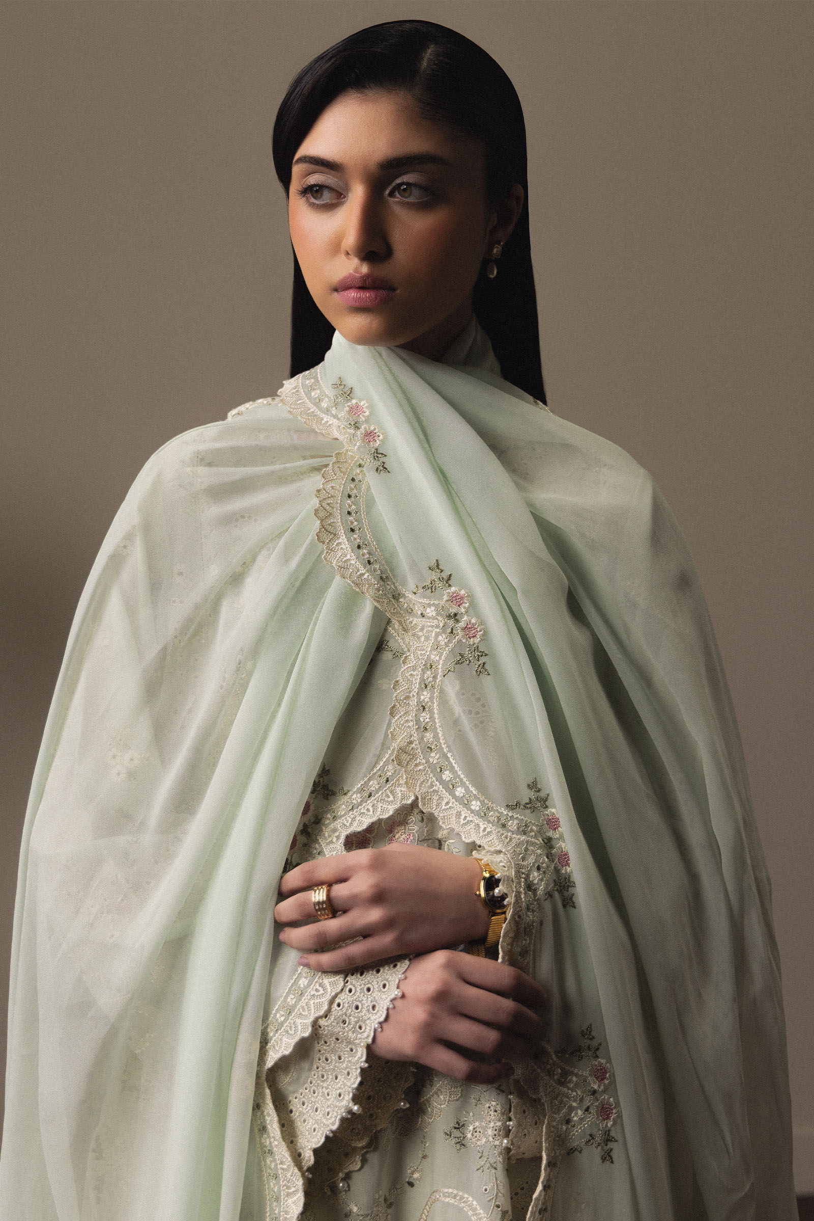 Aoiha is crafted in soothing aqua blue, adorned with floral and lace-inspired embroidery across the shirt and dupatta for a delicate, refined silhouette. Paired with matching embroidered cambric trousers and detailed front patches, the ensemble exudes understated sophistication and heritage-rooted grace.